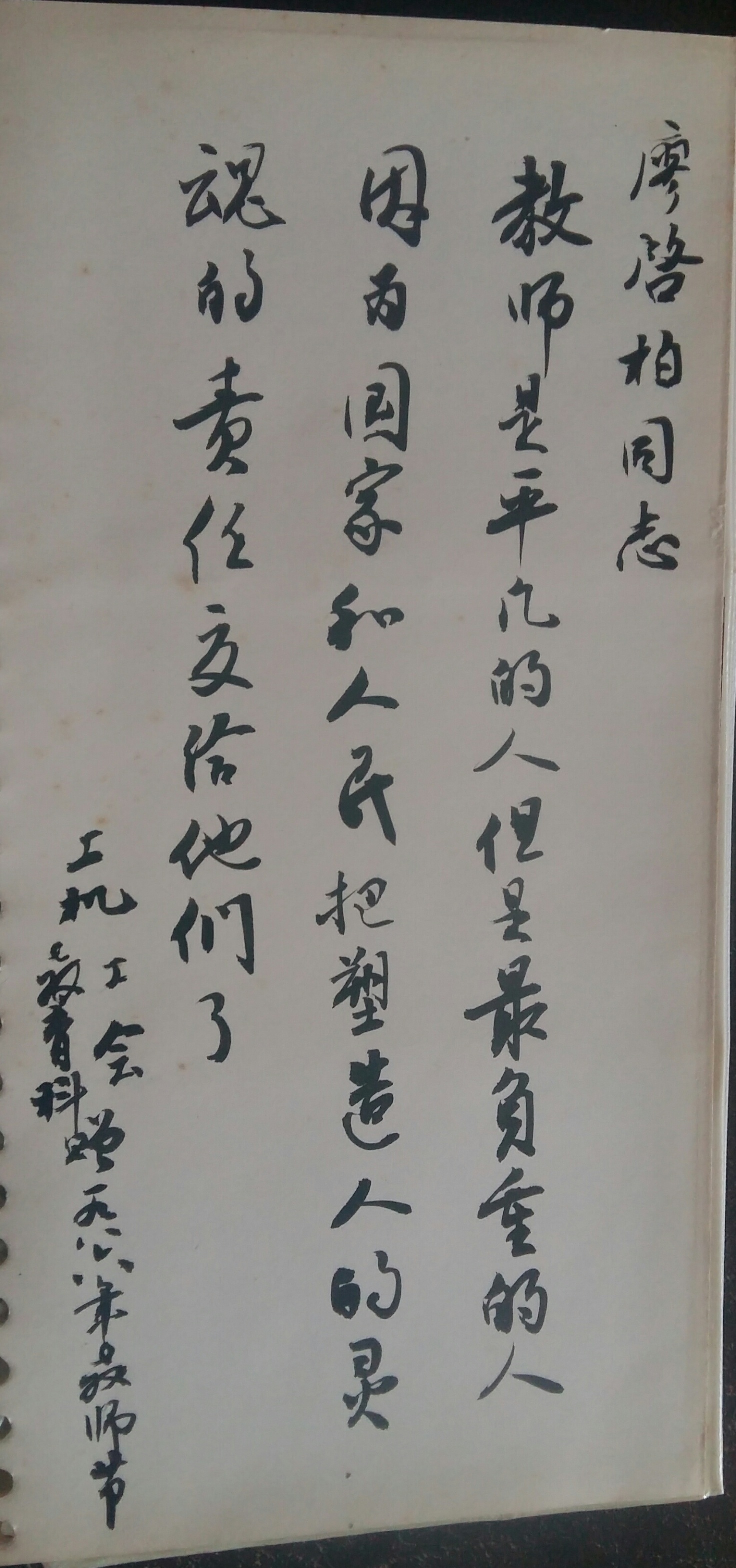 1986年教师节上海机床厂教育科、工会给作者刘翔岳父的题词