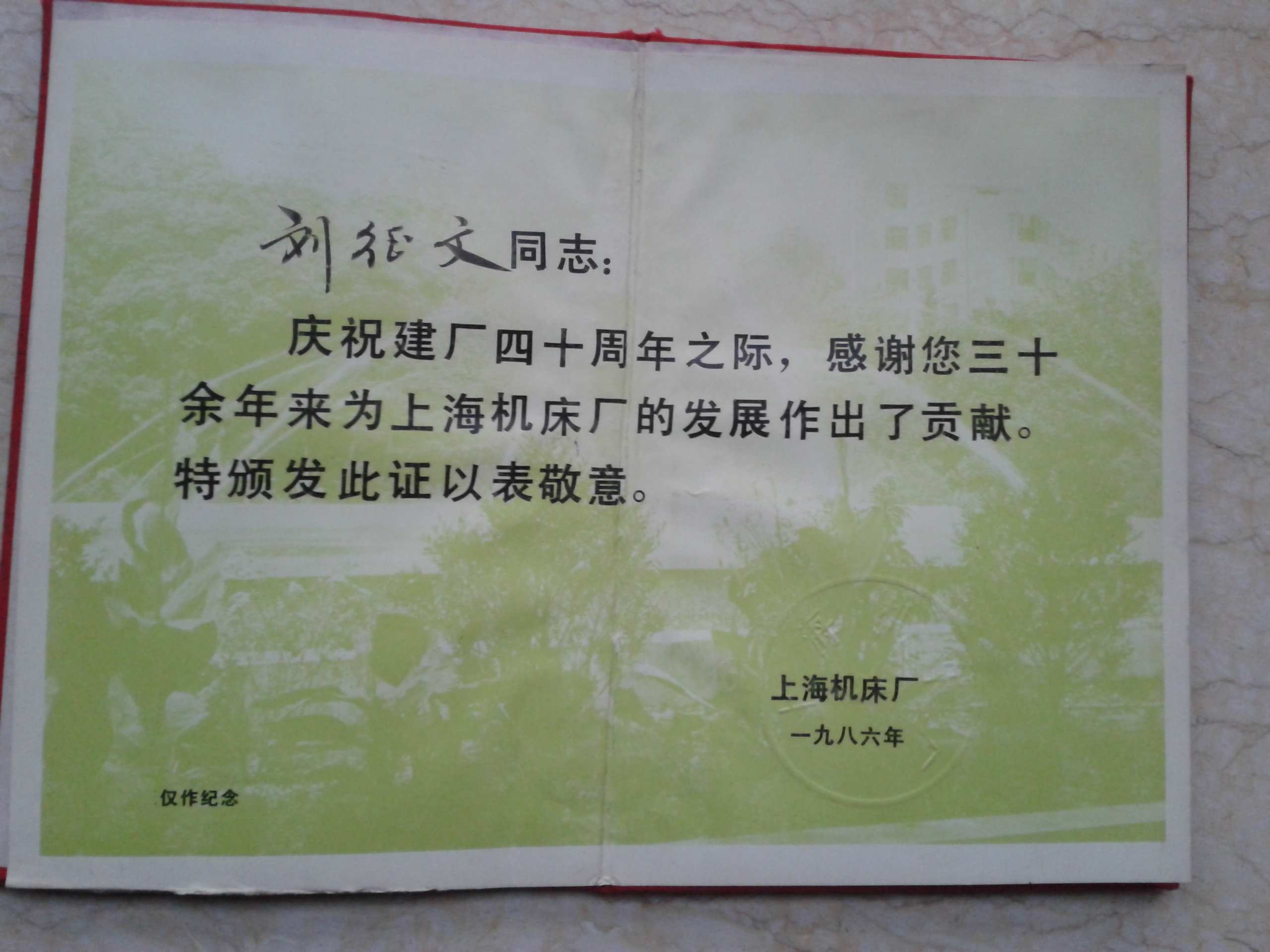 上海机床厂颁发给作者刘翔父亲建厂40周年荣誉证书