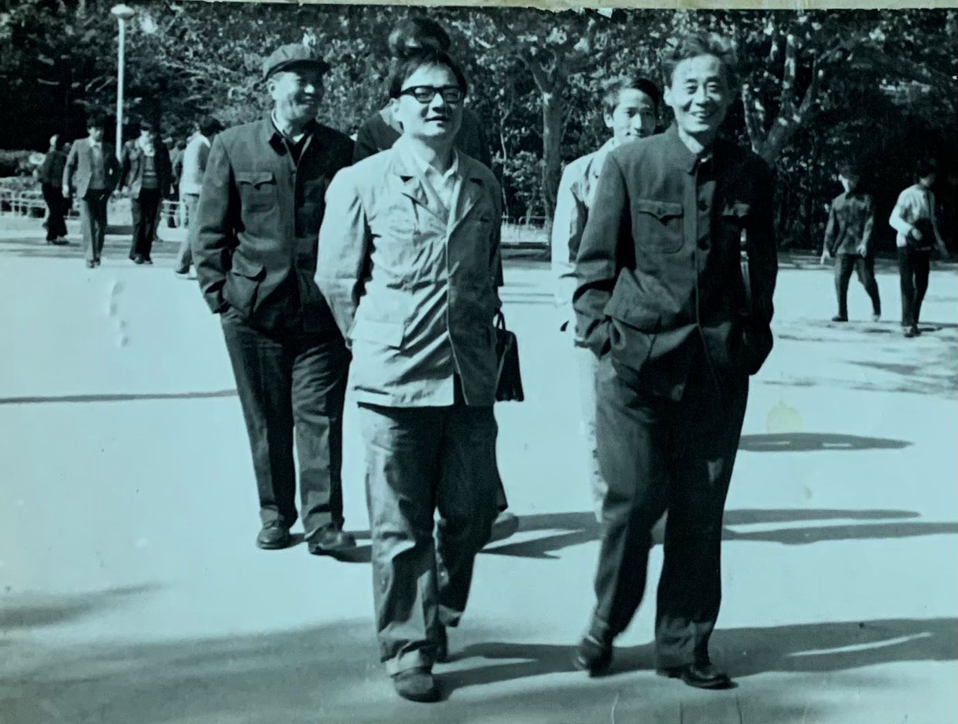作者刘翔父亲(前排右)上世纪80年代与同事兴高采烈地行走在中央大道
