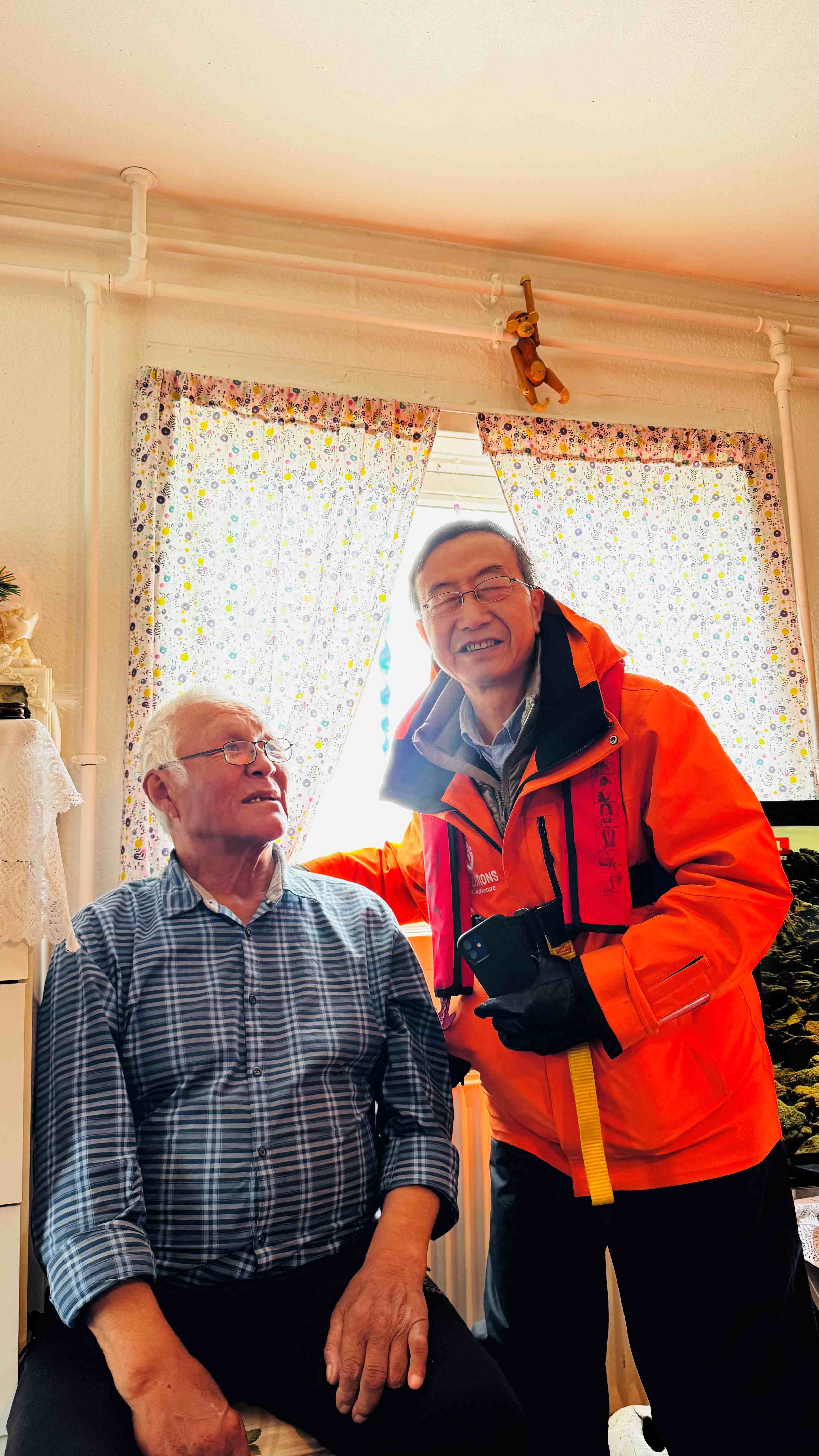 这时,我转头看到靠墙一边并排站着一位白发老爷爷和一对少年少女。他们面带微笑,恭迎我们这群远方来的游客。我仔细看着他们的面容、身材,特别是前额、眼睛、鼻子和嘴巴,确实很像蒙古人。我走上前去,心里自有一种亲切感。我对老爷子示意与他们三人一起合影。他马上友好地表示同意,我马上站在老爷子旁边,请旅友拍下了这张珍贵的照片。