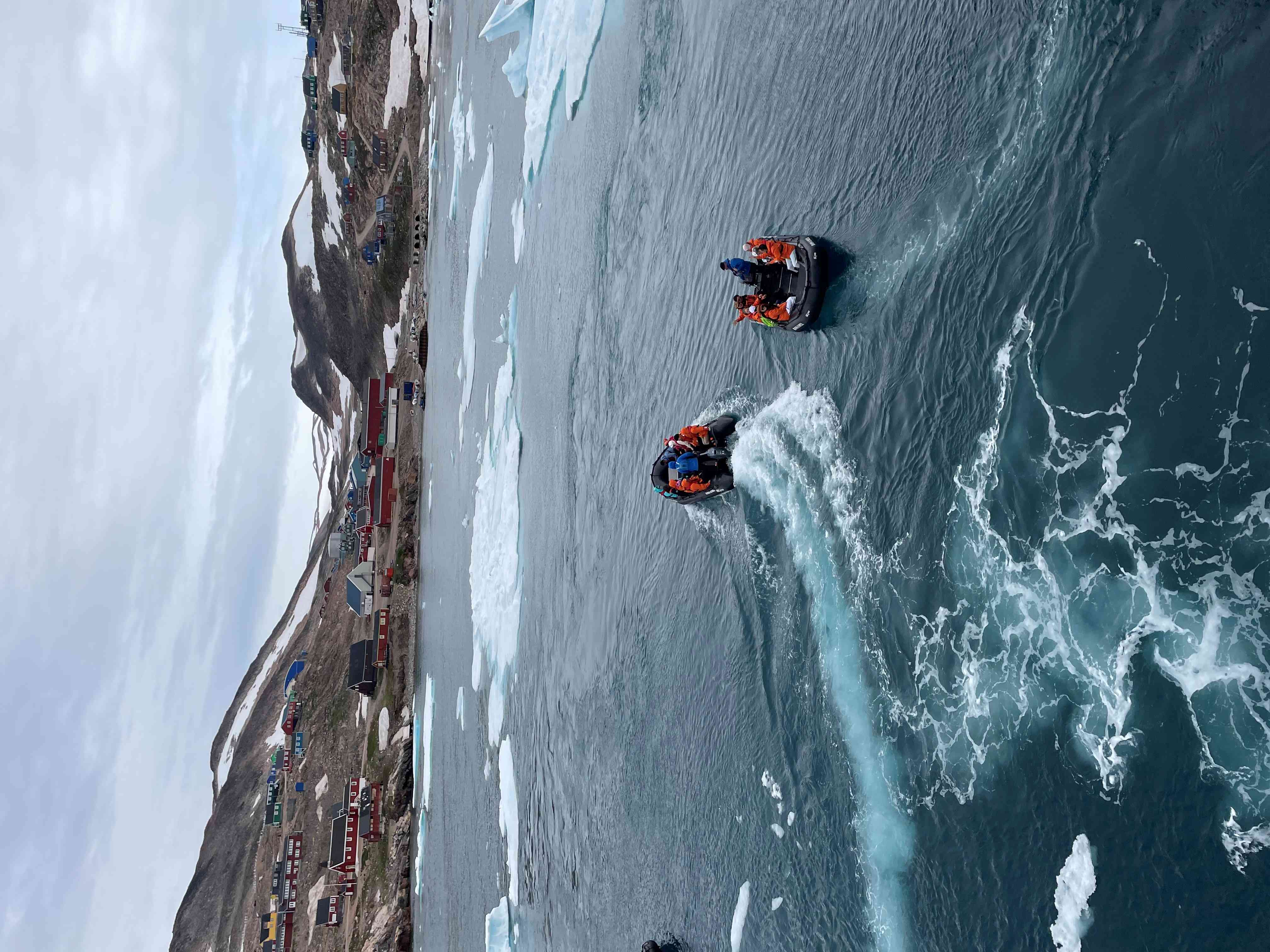 7月29日上午9点钟左右,虽然阳光灿烂,但气温却在1℃左右。我们穿上冲锋衣裤,套上长筒雨靴,戴上绒线帽、皮手套,十人一组依次从游轮下到冲锋艇上,而后那位欧洲小哥,驾驶冲锋艇飞速向前行驶,十几分钟后就来到了一处海滩,抬头一看,小岛的山坡上坐落着大大小小、五颜六色的尖顶房屋,酷似北欧风格。