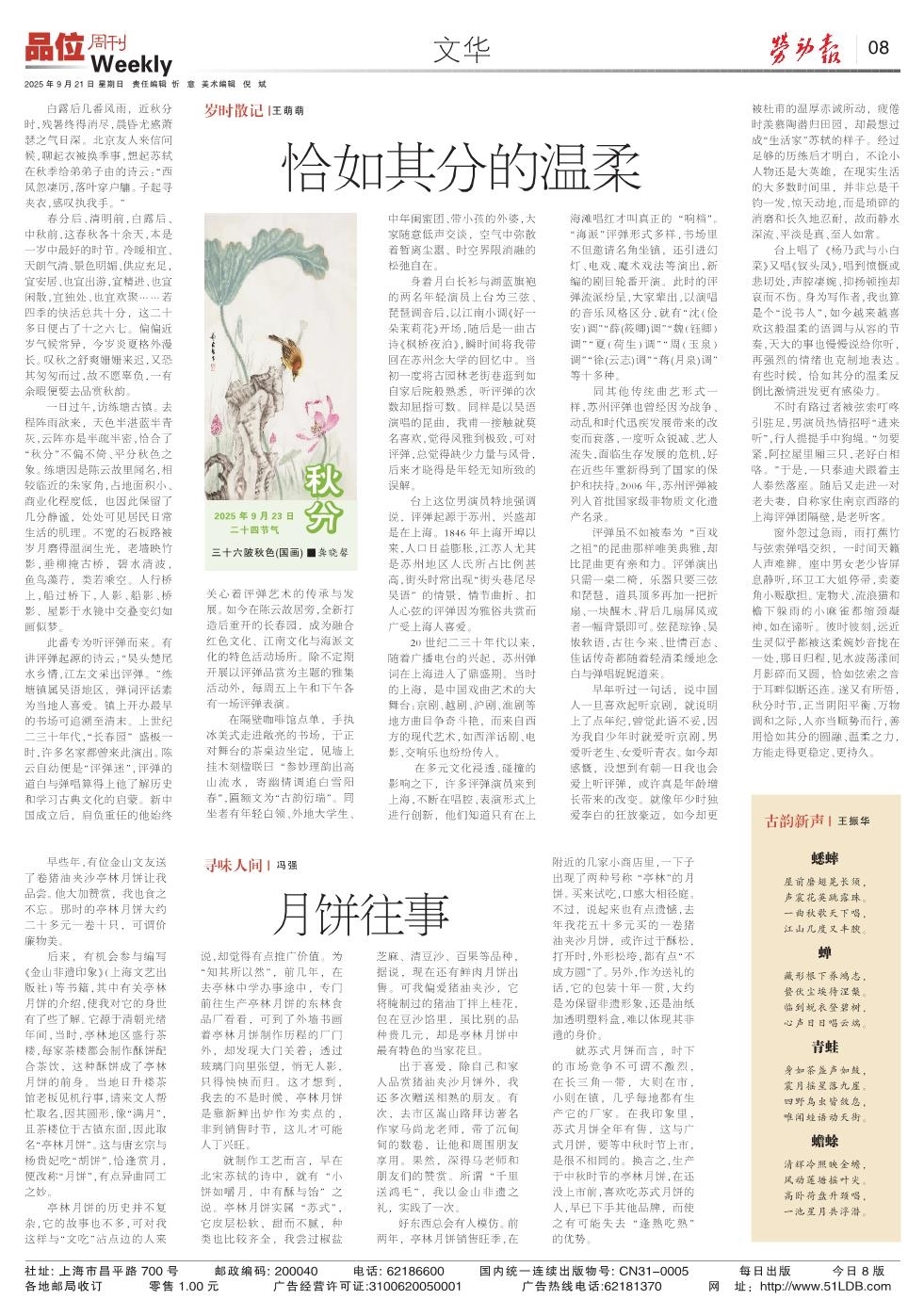 窗外忽过急雨,雨打蕉竹与弦索弹唱交织,一时间天籁人声难辨。座中男女老少皆屏息静听,环卫工大姐停帚,卖菱角小贩歇担。宠物犬、流浪猫和檐下躲雨的小麻雀都缩颈凝神,如在谛听。彼时彼刻,远近生灵似乎都被这柔婉妙音拢在一处,那日归程,见水波荡漾间月影碎而又圆,恰如弦索之音于耳畔似断还连。遂又有所悟,秋分时节,正当阴阳平衡、万物调和之际,人亦当顺势而行,善用恰如其分的圆融、温柔之力,方能走得更稳定、更持久。