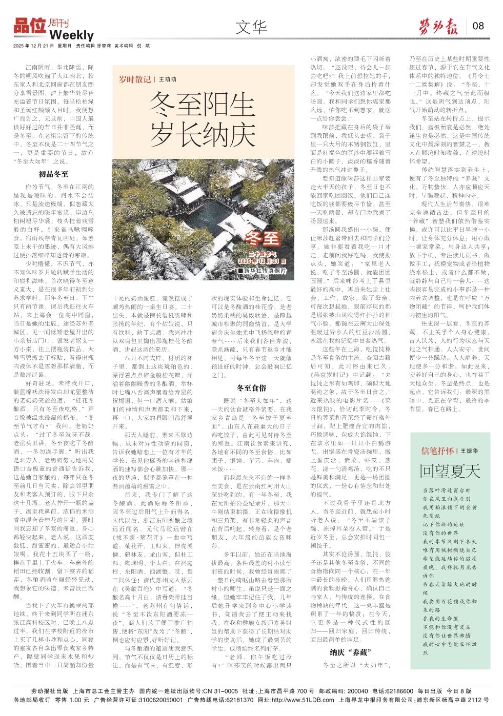 江南阴雨、华北降雪,隆冬的朔风吹遍了大江南北,胶东家人和北京同窗都在朋友圈分享雪景图,沪上繁华处尽皆充溢着节日氛围。每当松柏绿和圣诞红频频入目时,我便想广而告之,元旦前,中国人最该好好过的节日并非圣诞,而是冬至。在老祖宗留下的传统中,冬至不仅是二十四节气之一,更是重要的节日,故有“冬至大如年”之说。