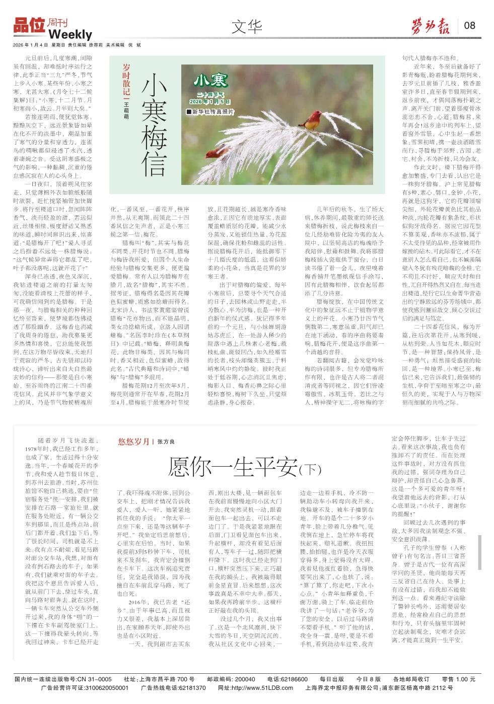 元旦前后,几度寒潮,间隙虽有回温,却难抵时序运行之律,此季正当“三九”严冬,节气上步入小寒。某些年份,小寒之寒,尤甚大寒。《月令七十二候集解》曰:“小寒,十二月节。月初寒尚小,故云。月半则大矣。”