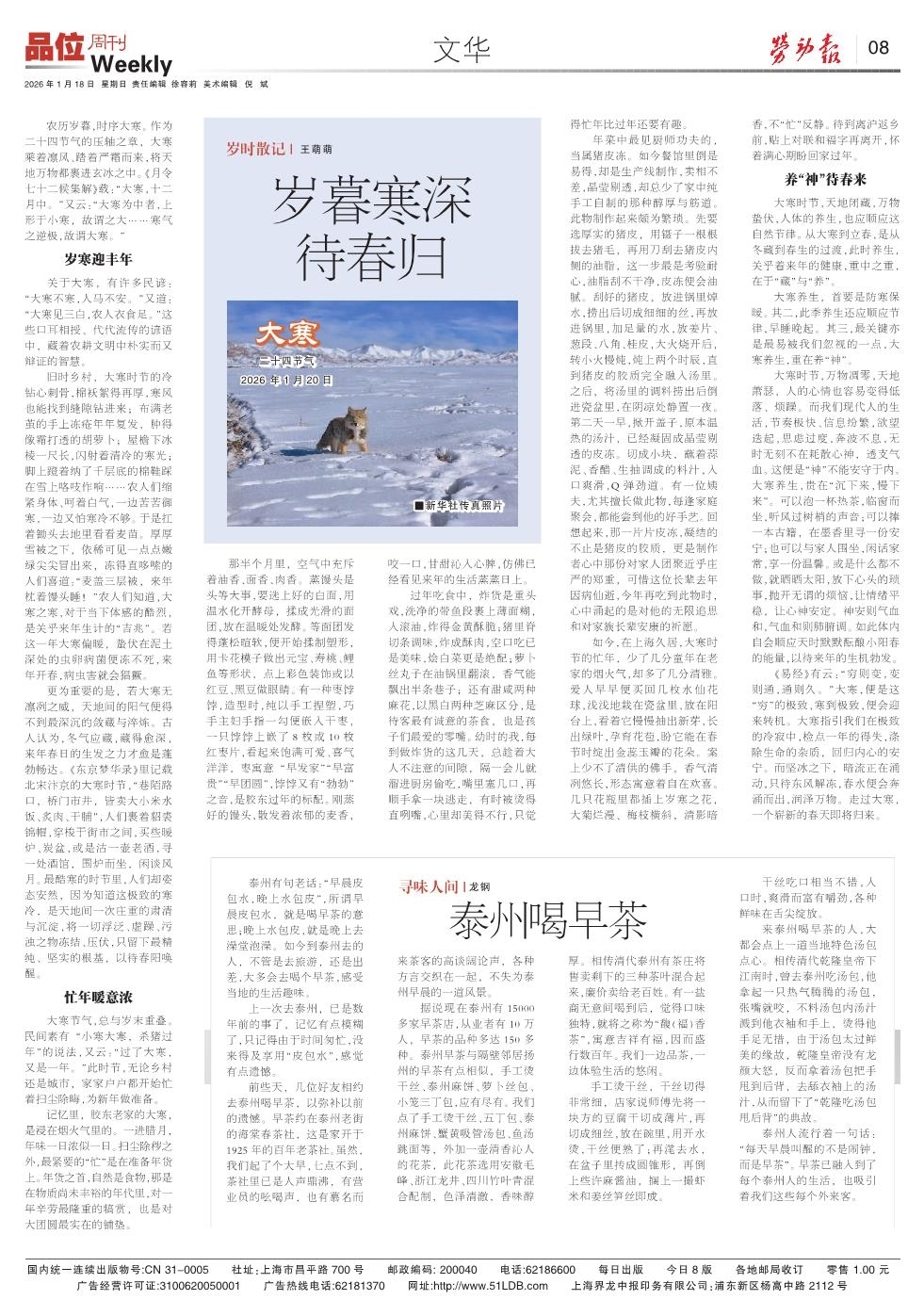 关于大寒,有许多民谚:“大寒不寒,人马不安。”又道:“大寒见三白,农人衣食足。”这些口耳相授、代代流传的谚语中,藏着农耕文明中朴实而又辩证的智慧。
