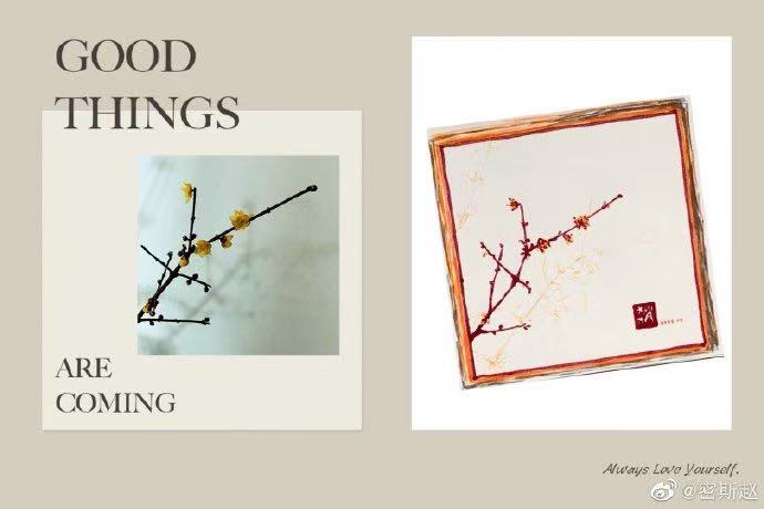 有一年我不但给蜡梅拍了照片,还设计了一方丝巾,将梅枝连同她映在墙上的影子,一同绘于方寸之间。色彩上我做了“失真”的处理,将金黄色的花瓣画成了红色,将灰色的影子画成了浅黄色。丝巾的边框部分则处理成了梅枝的沉稳模样。比审美更要紧的是,我仿佛可以想象妈妈系着它并且微微笑着的模样……