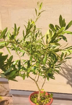 去年春天,懂我心思的朋友送了我一株橄榄树小苗,说是可以养活的,冬天放在向阳的室内就可以了。我将信将疑地收了下来,小心翼翼地种下后,放在露台一角,让它尽情接受阳光雨露,它也知趣地很快便开枝散叶了。仔细观察这株橄榄树苗,发现它从几厘米高就开始分岔,看上去像是两三棵长在一起,树干不挺拔甚至有些歪斜,粗糙的灰色树皮上密布沟壑。橄榄树的叶片很厚实且细长稀疏,正面是稍深的绿色,背面呈灰绿色。它长得很快,在阳光的抚摸下略显苍白的银绿色细长枝叶纷披,显得婆娑多姿,含蓄又不张扬,有着特别沉静的美感。夏天的炎热似乎很适合橄榄树的生长,即便是在38℃以上的高温它依旧长得很滋润,心想毕竟它的老家是在地中海边。不过,橄榄树很怕干旱,有一次我因出门旅游,大约三四天没有浇水,回来后发现它已耷拉下枝条,一副垂头丧气病恹恹的模样,赶紧搬到阴凉地里为它浇透水,这才慢慢地回过神来。虽说橄榄树的故乡是地中海,但倒也不怎么怕冷。寒潮骤起时,温度降到摄氏零度以下,我忘了拿进室内,它也无事,只是叶子稍稍有点耷拉,我赶紧把它搬进室内,因为不舍得它经受冬日的风刀霜剑。