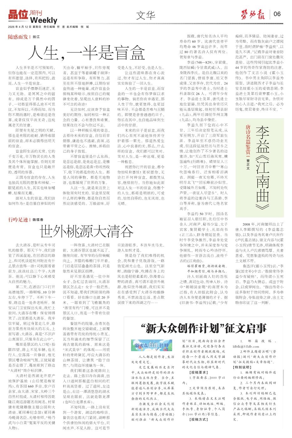 为激发全社会文化创新创造活力,反映当代大众真实生活与情感,《劳动报》副刊推出“新大众创作计划”栏目,现面向全社会开展征文活动,欢迎各行各业非职业创作者踊跃投稿,欢迎每一个普通人用文字描摹时代众生相,彰显新时代的文化自信与精神气象。