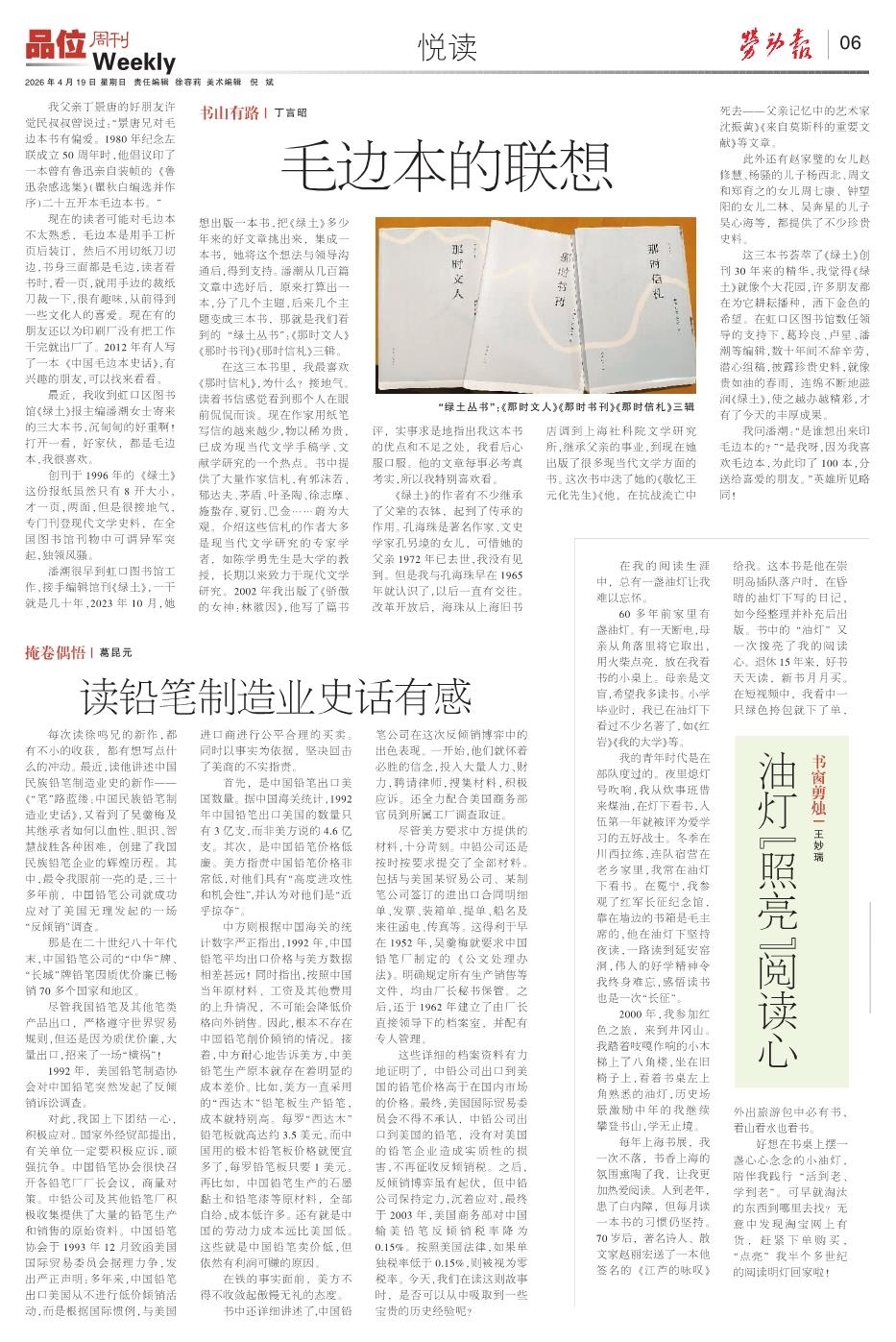 最近,我收到虹口区图书馆《绿土》报主编潘潮女士寄来的三大本书,沉甸甸的好重啊!打开一看,好家伙,都是毛边本,我很喜欢。
