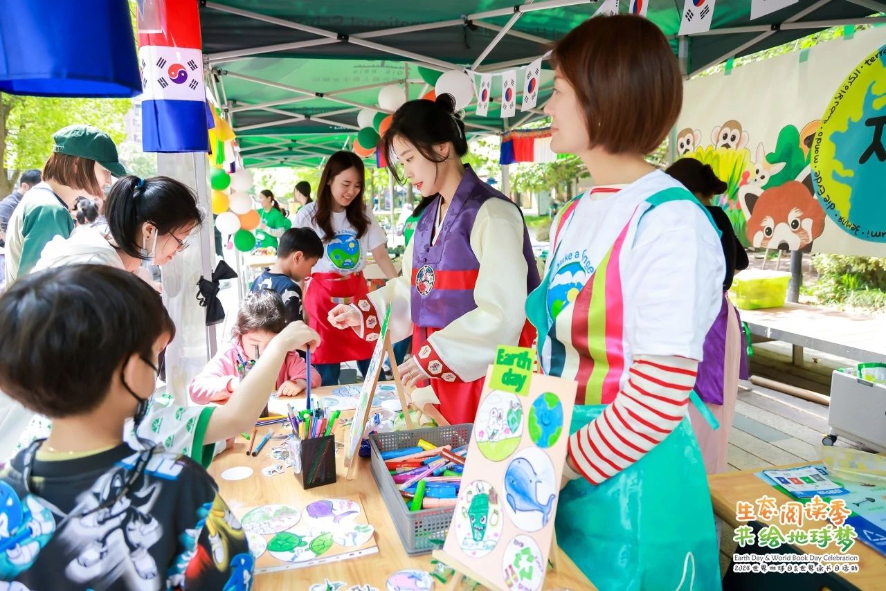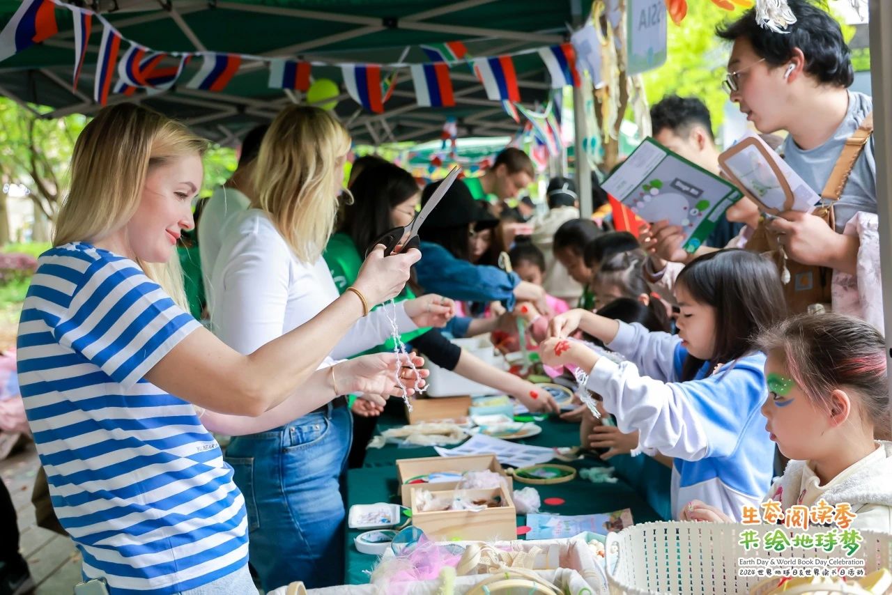 舞台四周,一顶顶凝结着各个国家居民生态创意与理念的帐篷在广场上蔓延开来。如中国的“飞花雅集 撷取绿意成诗”、巴西的“雨林保护色捉迷藏”、加拿大的“北极熊救援接力赛”、俄罗斯的“保护动物捕梦网”制作等环保活动互动,吸引近500名中外居民参与。这些活动不仅让人们在轻松愉快的氛围中感受到了阅读的魅力,更在潜移默化中传递了生态环保的理念。