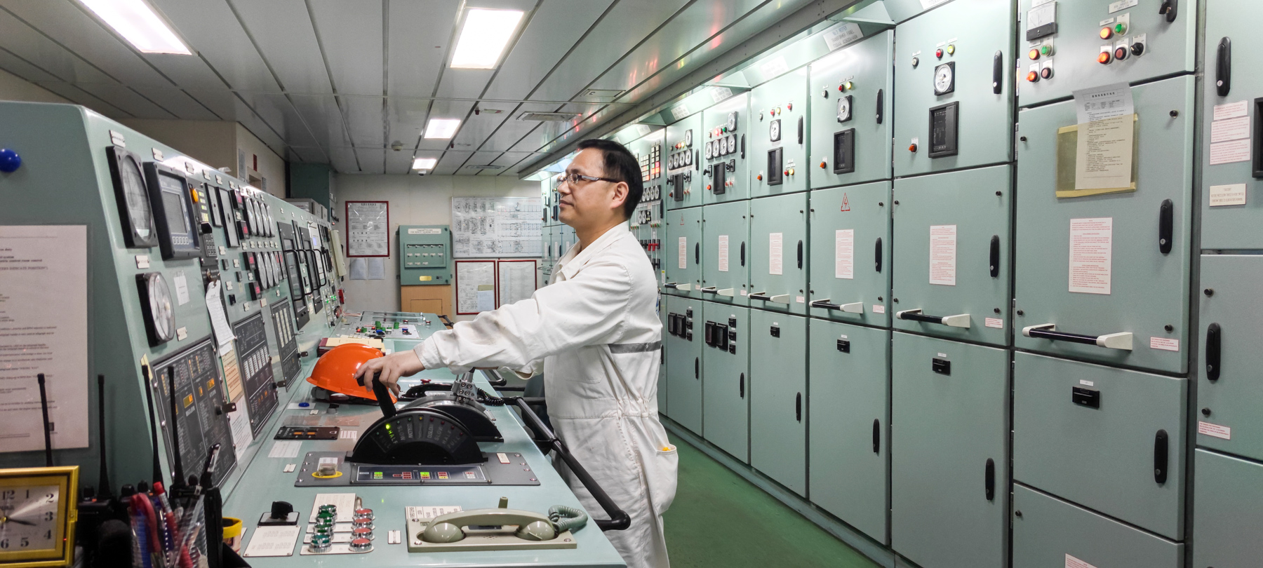 翱翔天际的飞机上,机长与副机长在驾驶室中操作,航行大海的巨轮里,船长在上层驾驶台进行指挥,而位于甲板下的船舶的“心脏”中,才是程邦武大展身手的地盘。船舶前行需要动力,提供动力的柴油机、螺旋桨等在船舱中,这些设备都在轮机长程邦武的管理范围内。