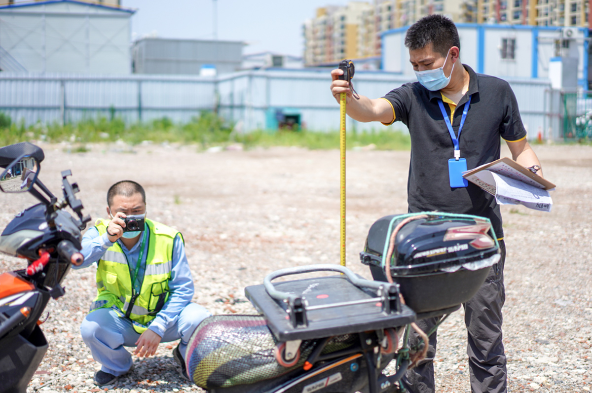 张志勇当天的勘查任务是一起两辆电动自行车刮擦事故的重新鉴定。“当事双方如果对首次鉴定结果有异议,可以依照相关程序申请再次鉴定。”现场,张志勇与同事根据委托方提供的车辆编号,从停车场的“车海”中找出事故中的两辆电动自行车,并推至空旷地带。“委托方提供给我们的现场图文材料以及问询笔录里,记录了其中一辆电动车发生事故时载有平板车、伸缩梯以及工具包等物品,但是现在只剩下了一辆平板车,其他涉案物品的缺失,对我们还原事故全貌增添了难度。”