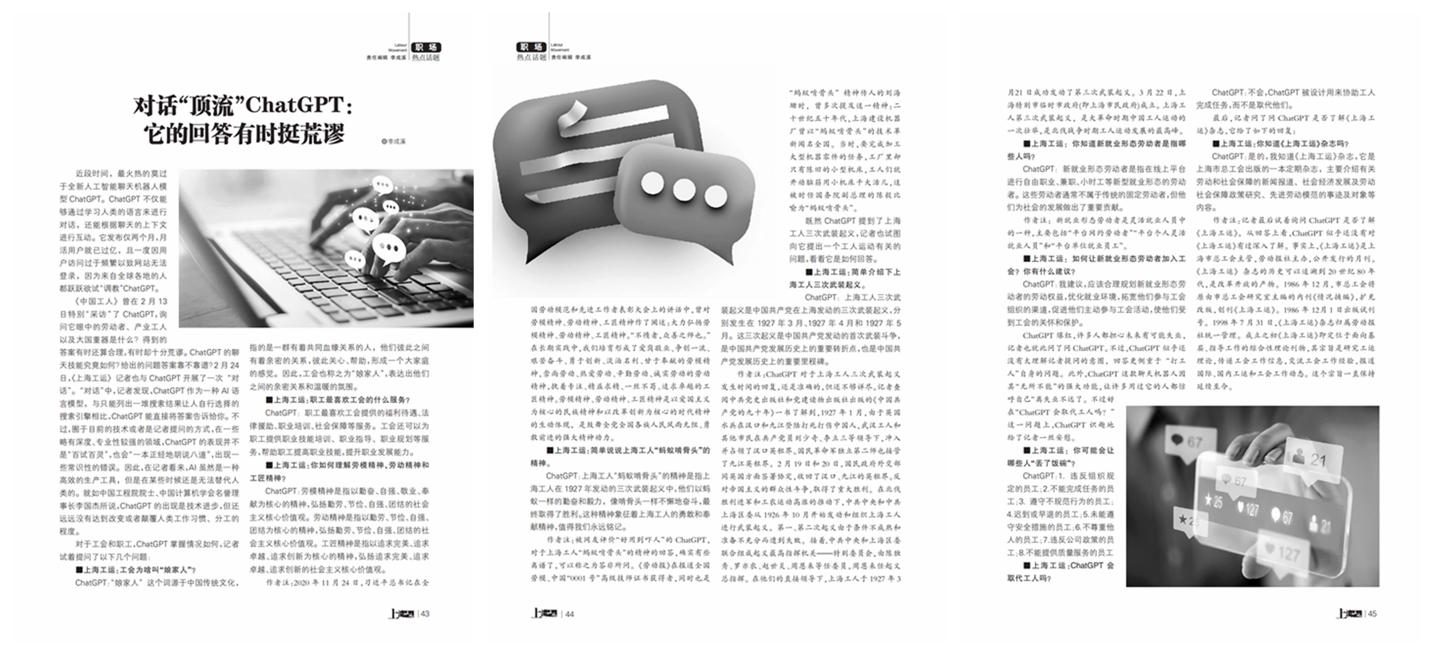 作者注:记者最后试着询问ChatGPT是否了解《上海工运》,从回答上看,ChatGPT似乎还没有对《上海工运》有过深入了解。事实上,《上海工运》是上海市总工会主管,劳动报社主办,公开发行的月刊。《上海工运》杂志的历史可以追溯到20世纪80年代,是改革开放的产物。1986年12月,市总工会将原由市总工会研究室主编的内刊《情况摘编》,扩充改版,创刊《上海工运》。1986年12月1日出版试刊号。1998年7月31日,《上海工运》杂志归属劳动报社统一管理。成立之初《上海工运》即定位于面向基层、指导工作的综合性理论刊物,其宗旨是研究工运理论,传递工会工作信息,交流工会工作经验,报道国际、国内工运和工会工作动态。这个宗旨一直保持延续至今。