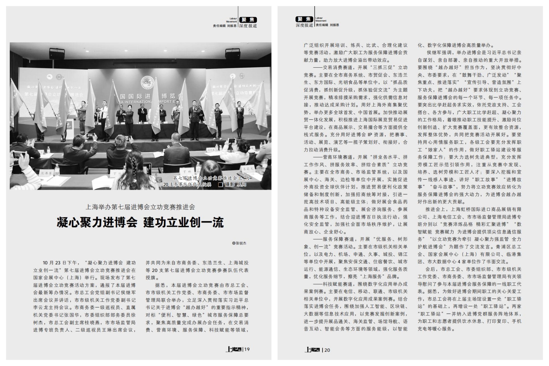 10月23日下午,“凝心聚力进博会 建功立业创一流”第七届进博会立功竞赛推进会在国家会展中心(上海)举行。现场发布了第七届进博会立功竞赛活动方案,通报了本届进博会最新筹办情况。现场为20支第七届进博会立功竞赛参赛队伍代表授旗。
