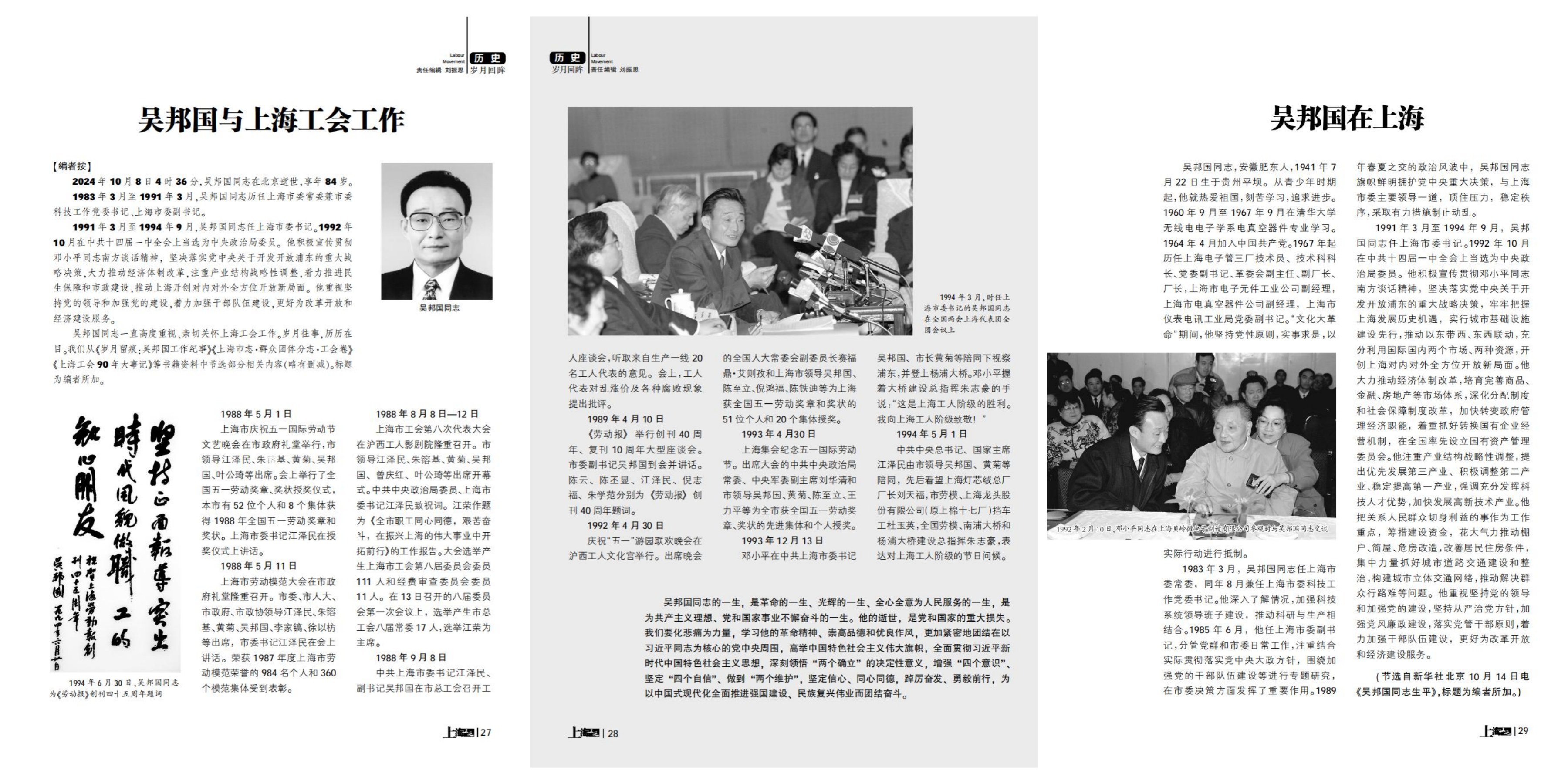 吴邦国同志一直高度重视、亲切关怀上海工会工作。岁月往事,历历在目。我们从《岁月留痕:吴邦国工作纪事》《上海市志·群众团体分志·工会卷》《上海工会90年大事记》等书籍资料中节选部分相关内容(略有删减)。