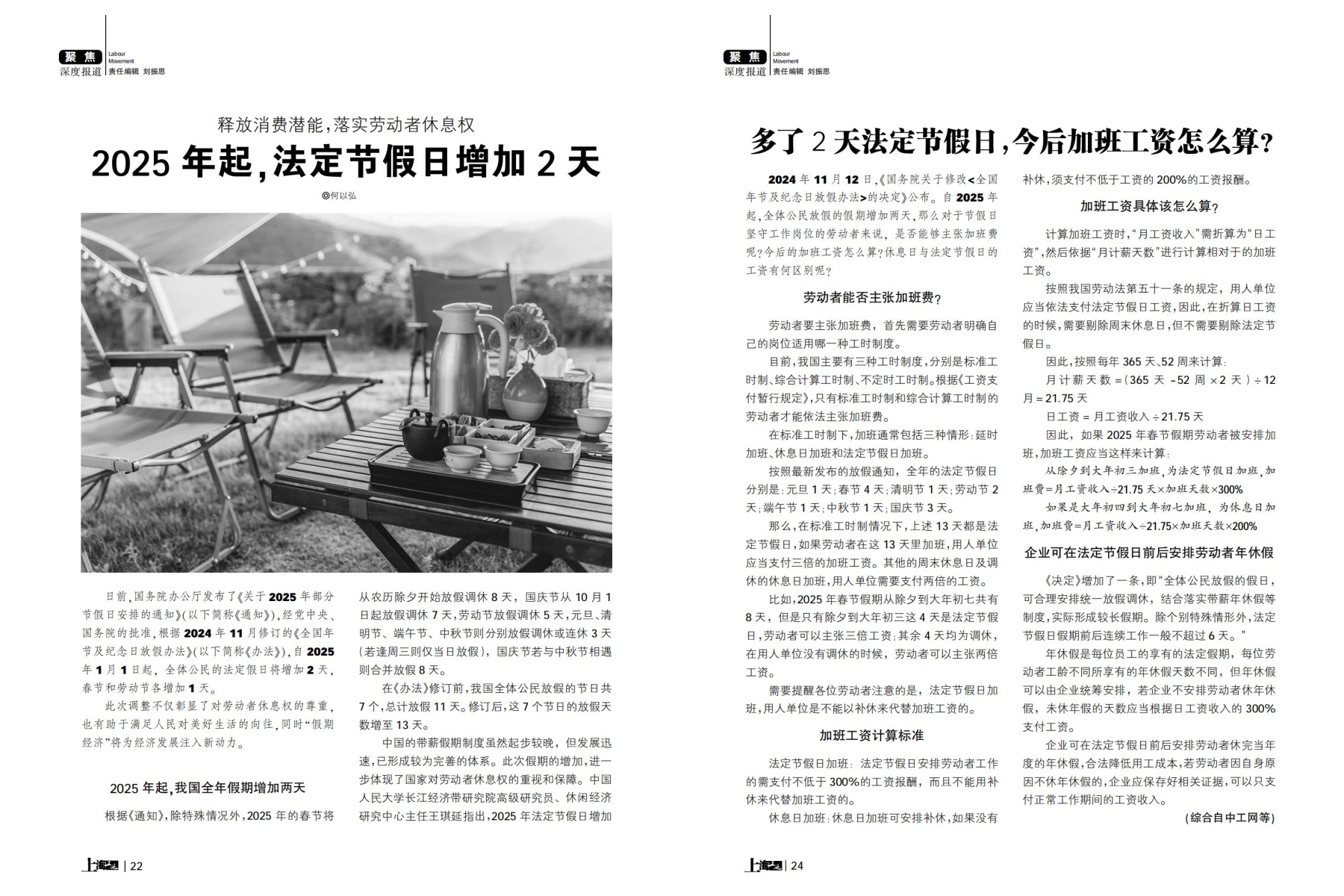 自2025年1月1日起,全体公民的法定假日将增加2天,春节和劳动节各增加1天。此次调整不仅彰显了对劳动者休息权的尊重,也有助于满足人民对美好生活的向往,同时“假期经济”将为经济发展注入新动力。