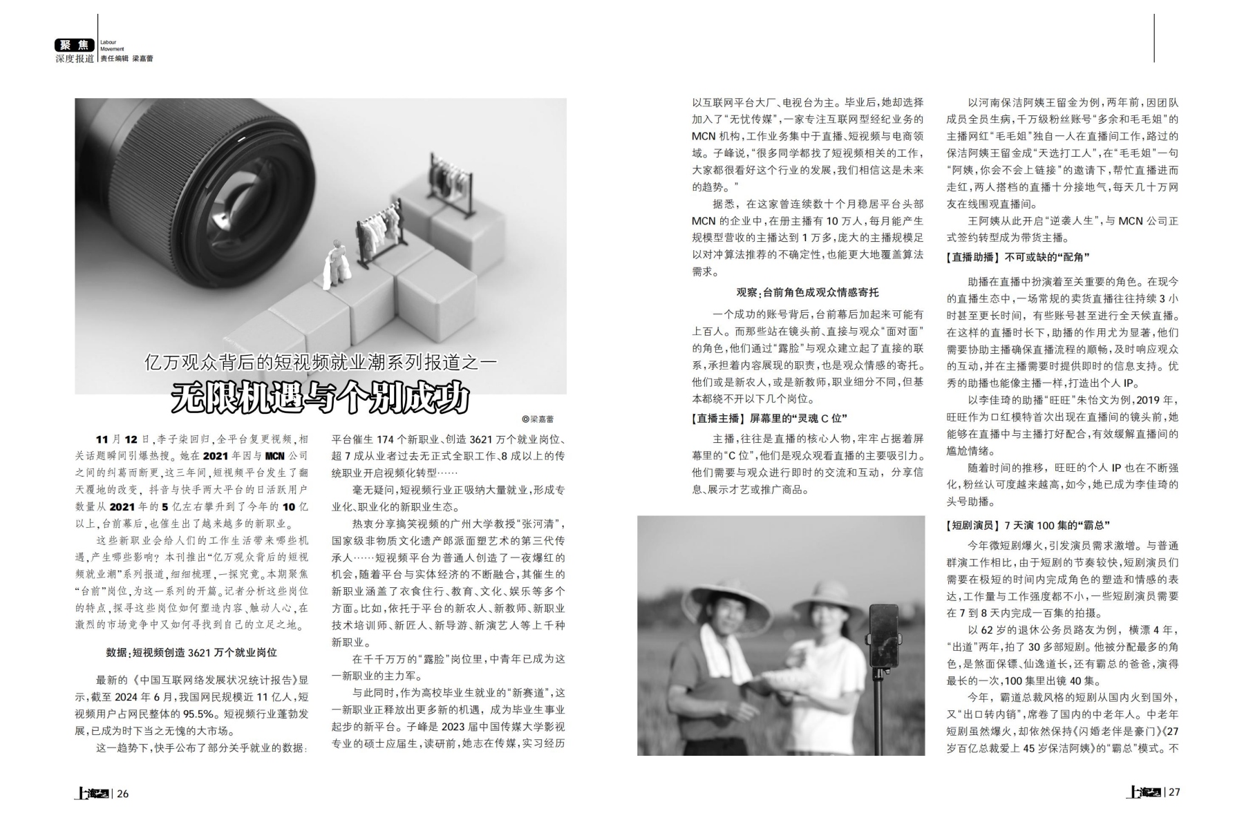 新职业会给人们的工作生活带来哪些机遇,产生哪些影响?本刊推出“亿万观众背后的短视频就业潮”系列报道,细细梳理,一探究竟。本期聚焦“台前”岗位,为这一系列的开篇。记者分析这些岗位的特点,探寻这些岗位如何塑造内容、触动人心,在激烈的市场竞争中又如何寻找到自己的立足之地。