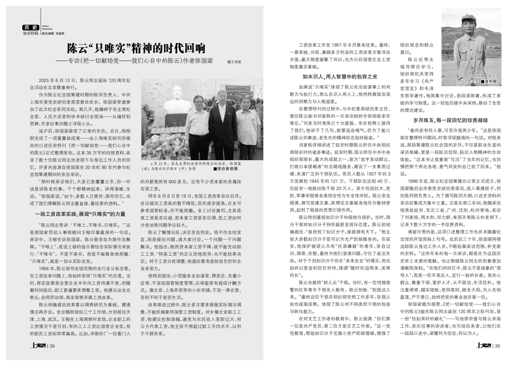 作为陈云纪念馆筹建时期的陈列负责人、中共上海市委党史研究室原宣教处处长,徐国梁受邀参加了此次纪念系列活动。返沪后,徐国梁接受了记者的专访。近期,他刚刚完成了一项重量级成果——《把一切献给党——我们心目中的陈云》正式整理发布。这本35万字的内部资料,收录了数十位陈云同志的老部下与身边工作人员的回忆,成为陈云“只唯实”精神的时代回响。