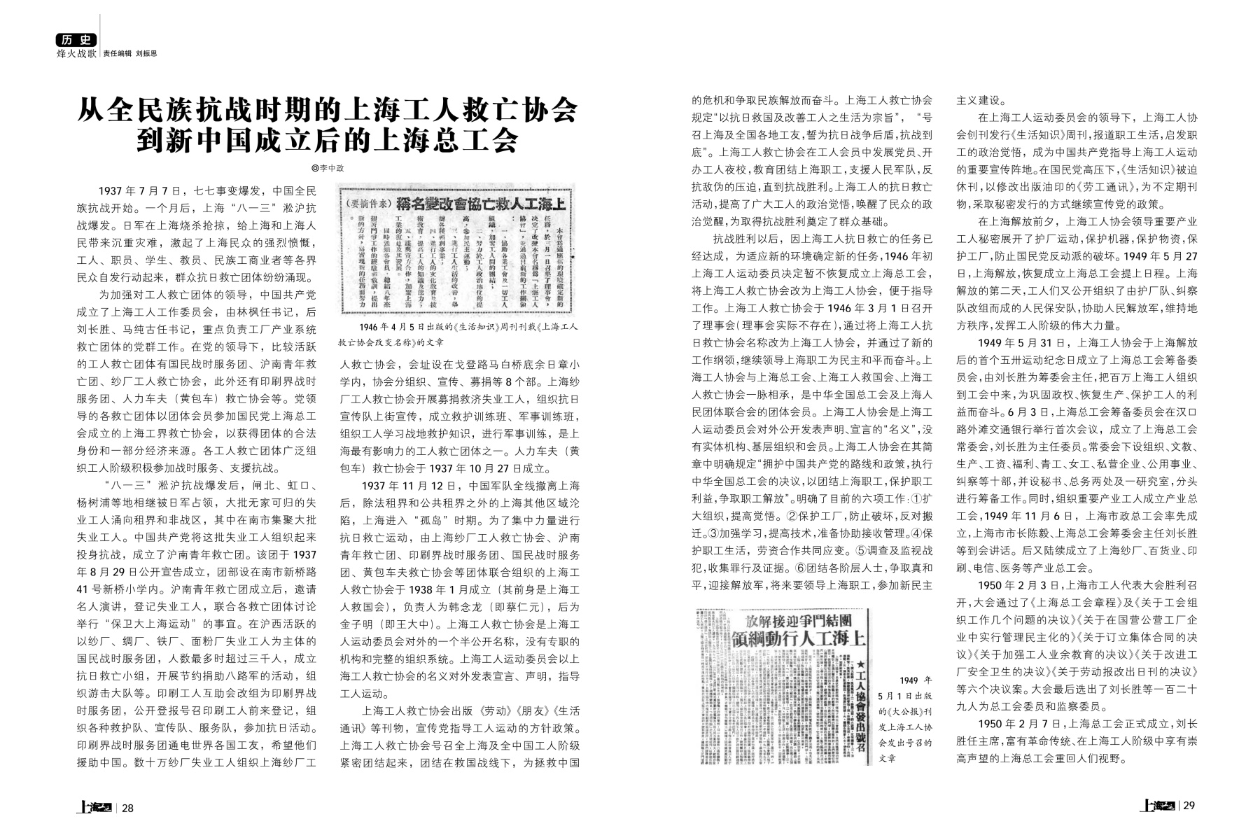从全民族抗战时期的上海工人救亡协会到新中国成立后的上海总工会