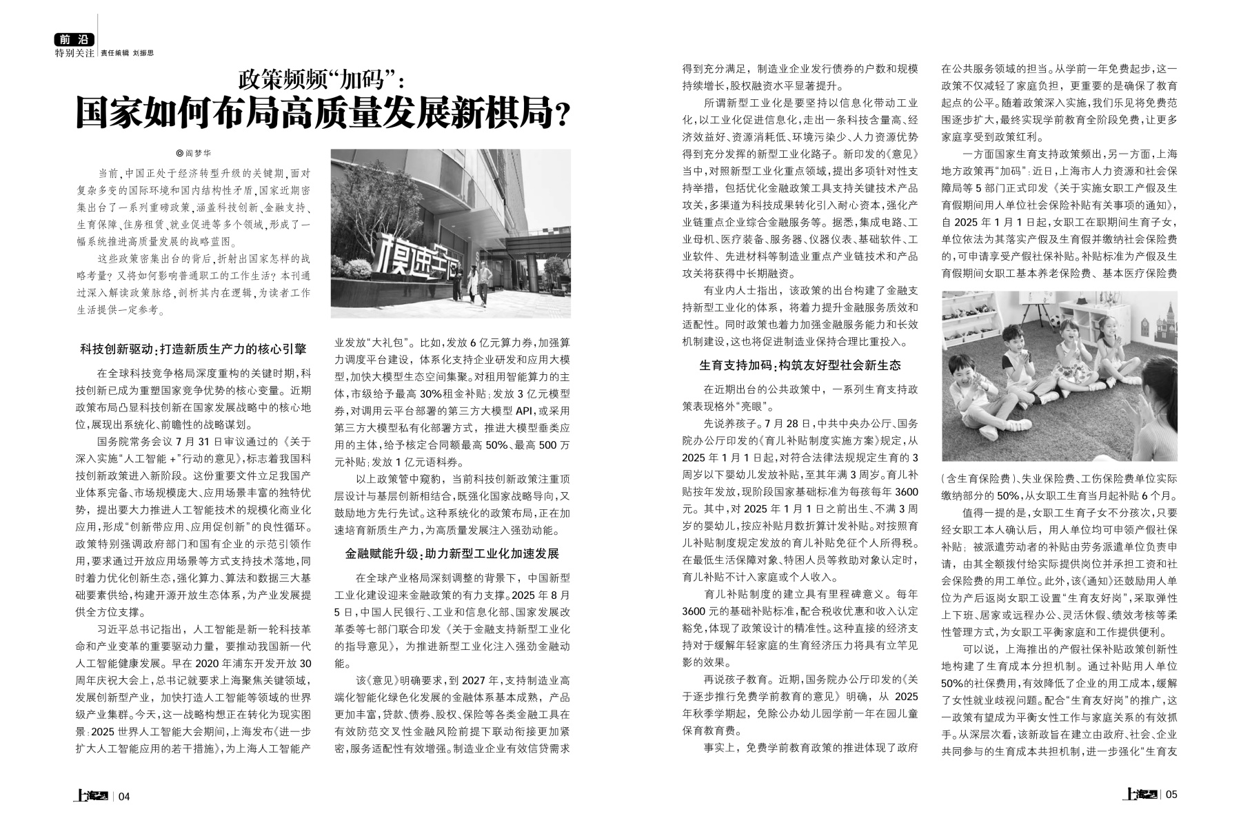 近期,国家密集出台了一系列重磅政策,涵盖科技创新、金融支持、生育保障、住房租赁、就业促进等多个领域,形成了一幅系统推进高质量发展的战略蓝图。这些政策密集出台的背后,折射出国家怎样的战略考量?又将如何影响普通职工的工作生活?本刊通过深入解读政策脉络,剖析其内在逻辑,为读者工作生活提供一定参考。