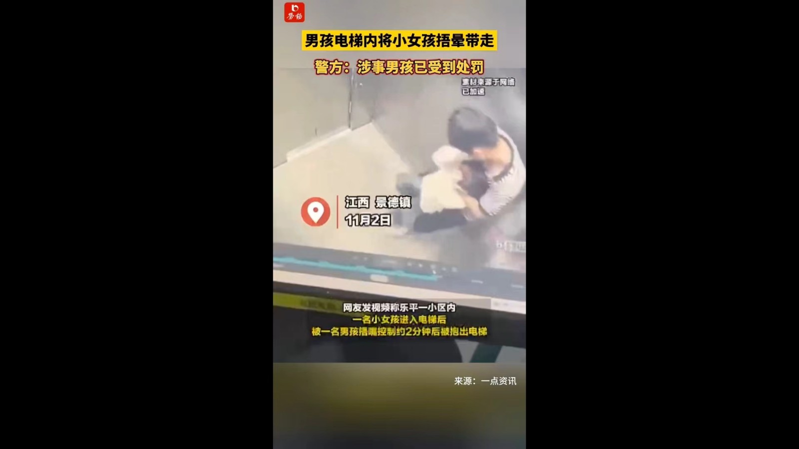 男孩电梯内将小女孩捂晕带走,警方:涉事男孩已受到处罚