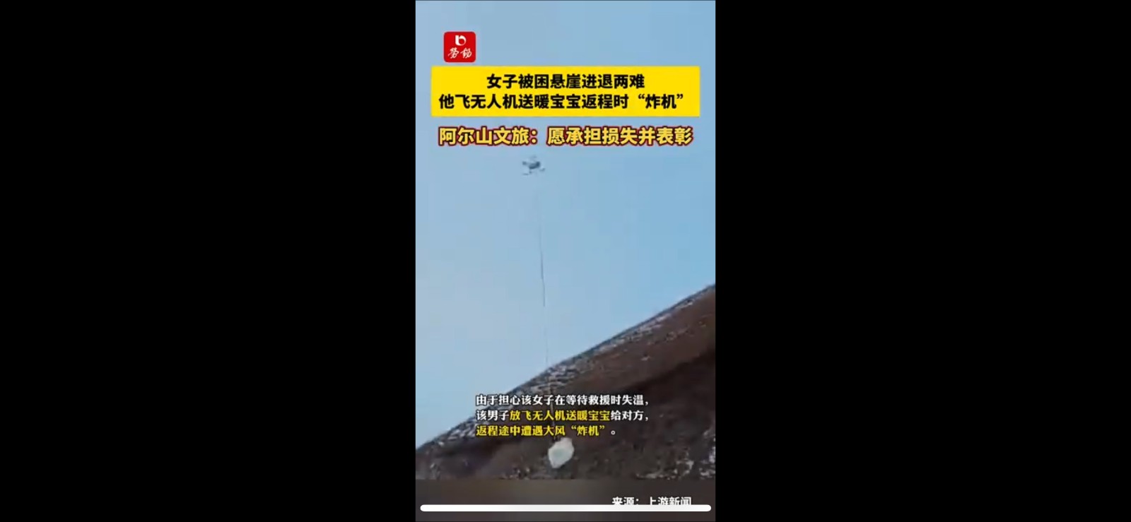女子被困悬崖进退两难,他飞无人机送暖宝宝返程时“炸机”,阿尔山文旅:愿承担损失并表彰。