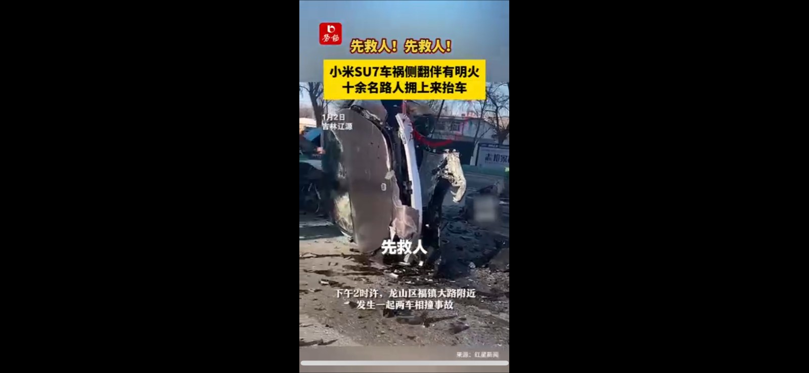 先救人!先救人! 小米SU7车祸侧翻伴有明火 ,十余名路人拥上来抬车。