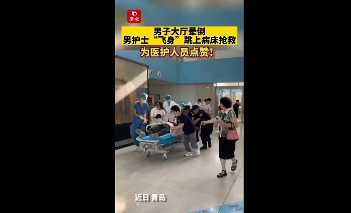 摘要: 男子大厅晕倒,男护士“飞身”跳上病床抢救,为医护人员点赞!