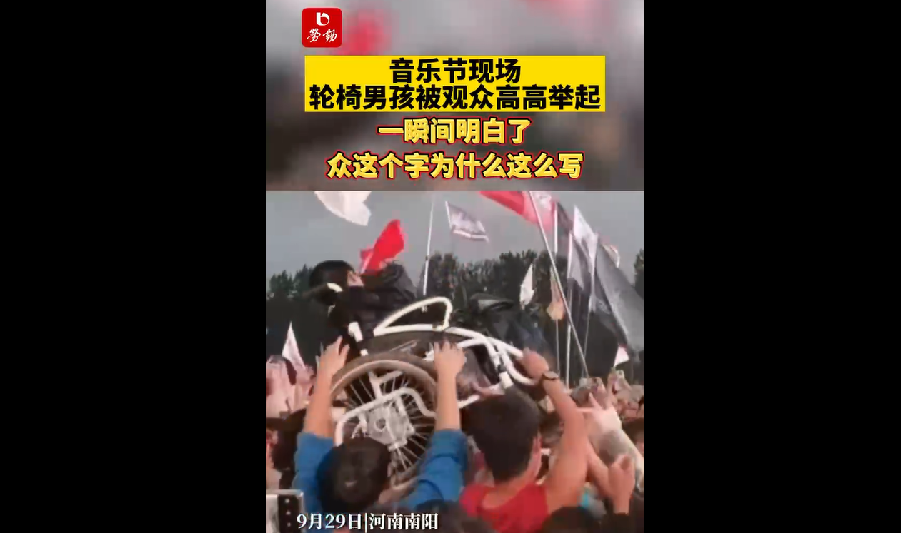 音乐节现场,轮椅男孩被观众高高举起,一瞬间明白了,众这个字为什么这么写。