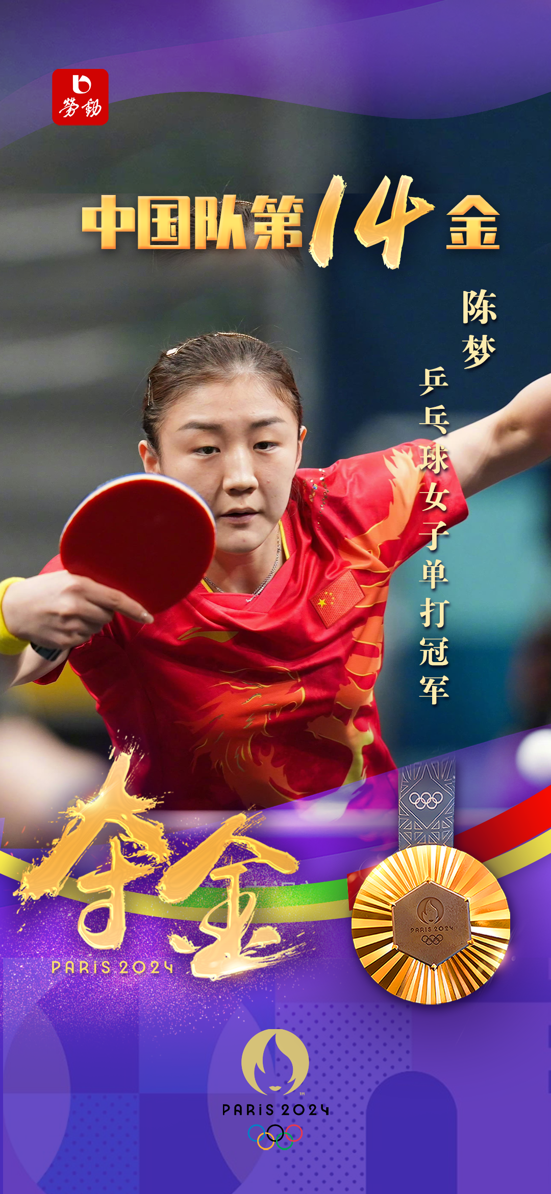 北京时间8月3日,在巴黎奥运会乒乓球女子单打决赛中, 中国选手陈梦战胜队友孙颖莎,成功卫冕,夺得金牌。这也是中国代表团在本届奥运会上获得的第14枚金牌。