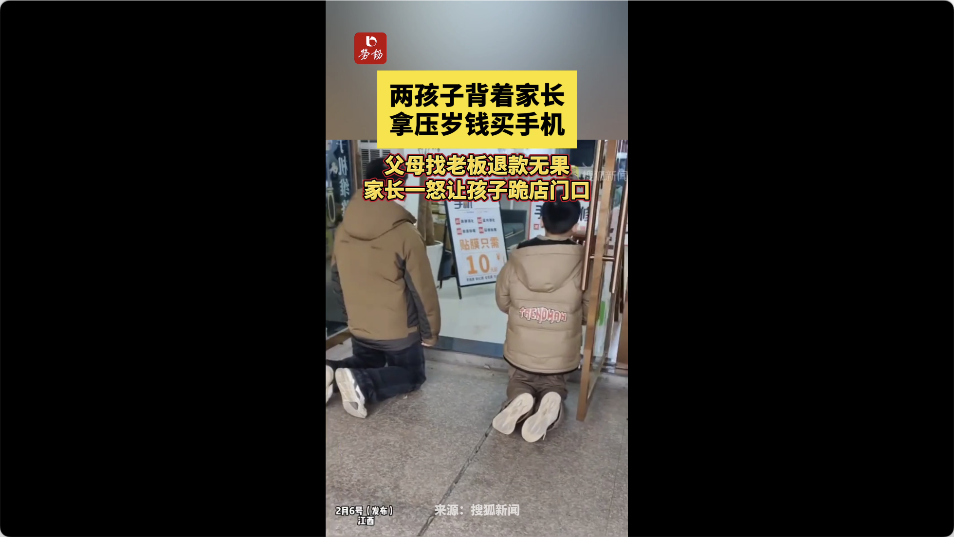 两孩子背着家长拿压岁钱买手机,父母找老板退款无果,家长一怒让孩子跪店门口