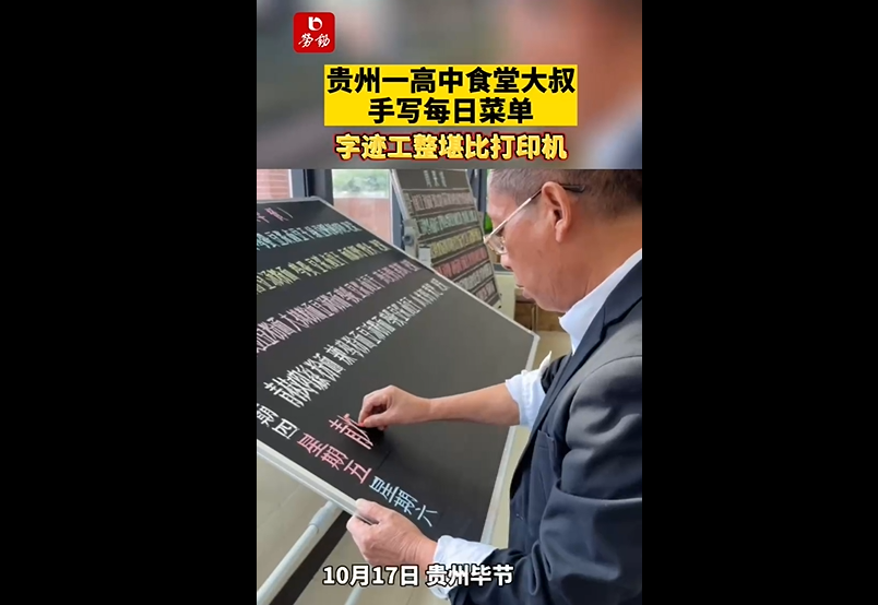 贵州一高中食堂大叔手写每日菜单,字迹工整堪比打印机