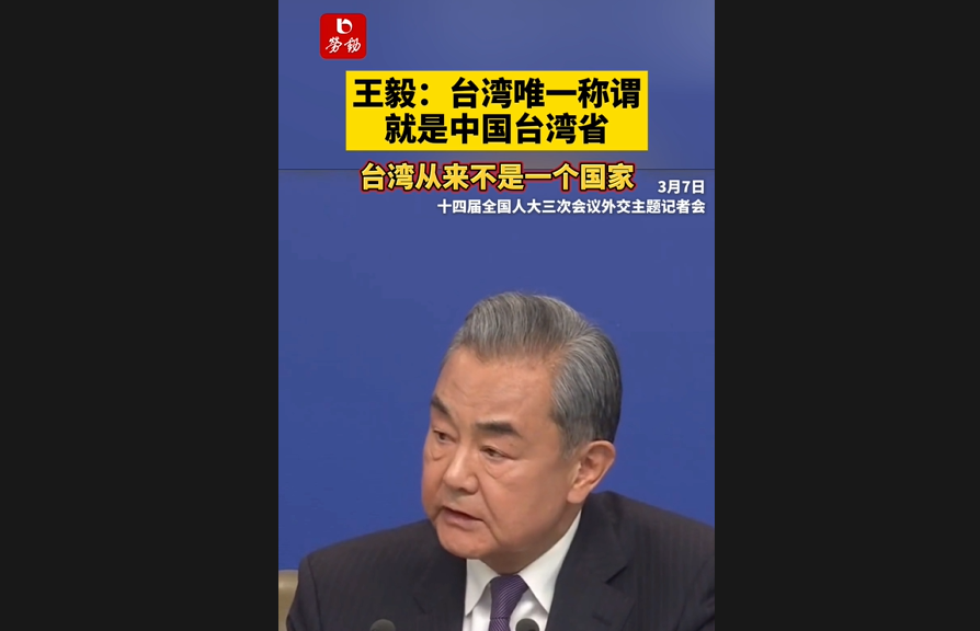 王毅:台湾唯一称谓就是中国台湾省,台湾从来不是一个国家。