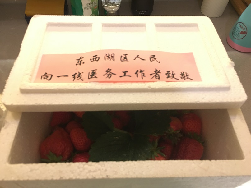 中午在餐厅喝到了小排冬瓜汤,诧异之后问师傅,几天来又是红烧肉、凤爪、又是小排冬瓜汤的,是不是专门做上海菜的?师傅回答说里面的大厨专门学过上海菜。感谢酒店领导的安排,你们时时刻刻给了我们家的感觉。吃完中饭,到一楼大堂领了一盒草莓,这些新鲜采摘的草莓,代表的是东西湖区人民对我们一线医务工作者的心意,真是吃在口中,暖在心里啊。