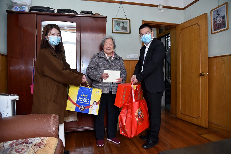 在老军医宋中慧老人家里,瑞漾公司负责人梁钧捷将沉甸甸的春节大礼包递到她手上,并向老人致以新春问候。
