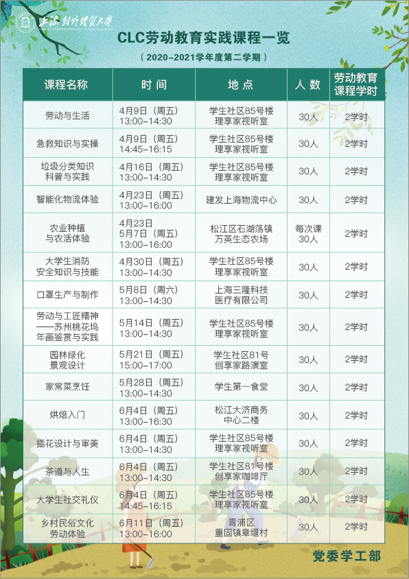 除此之外,在5月份,上海对外经贸大学集中开展第一届劳动教育活动月,主题为:“劳动最光荣,建功新时代 ”, 活动将分为“以劳树德”“以劳增智”“以劳强体”“以劳育美”“以劳创新”五大版块展开。“劳模进校园”系列讲座也在同期开展。