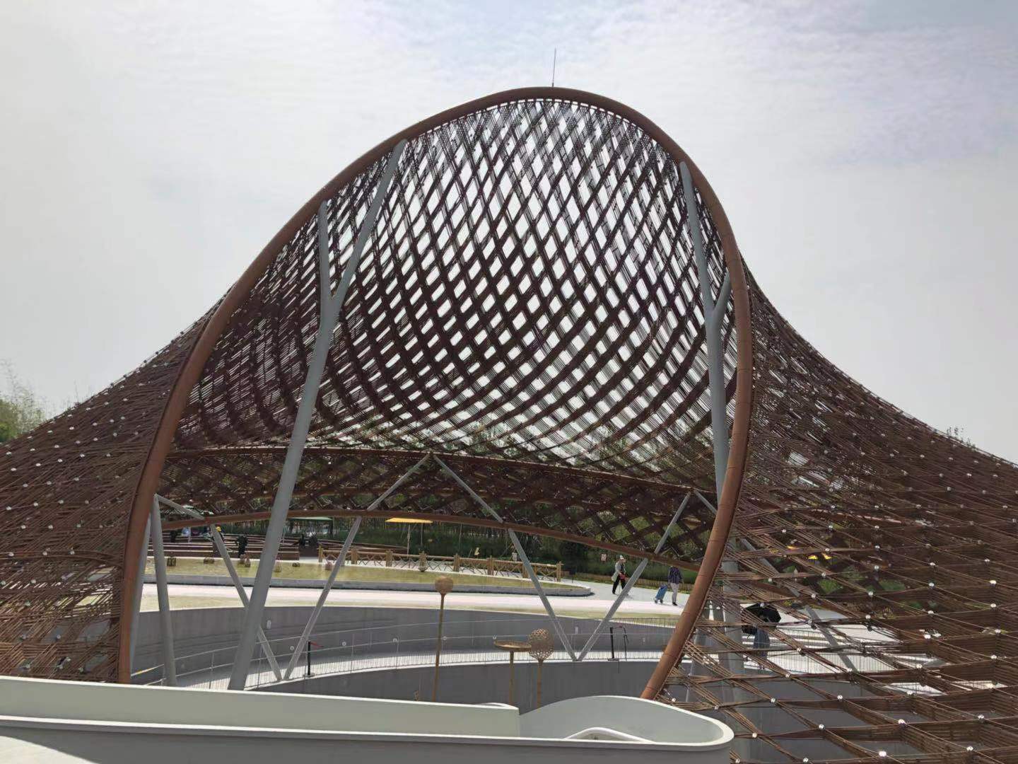在葛勇的指引下,记者沿着竹藤馆的台阶走到了馆中央,从这里近距离观察四周的竹墙,果然与仰视、俯瞰全都不一样。原来,它完美展现了竹藤馆独有的弧度。形态自然流畅,竹子原色的屋面也凸显出了细腻丰富的肌理质感。