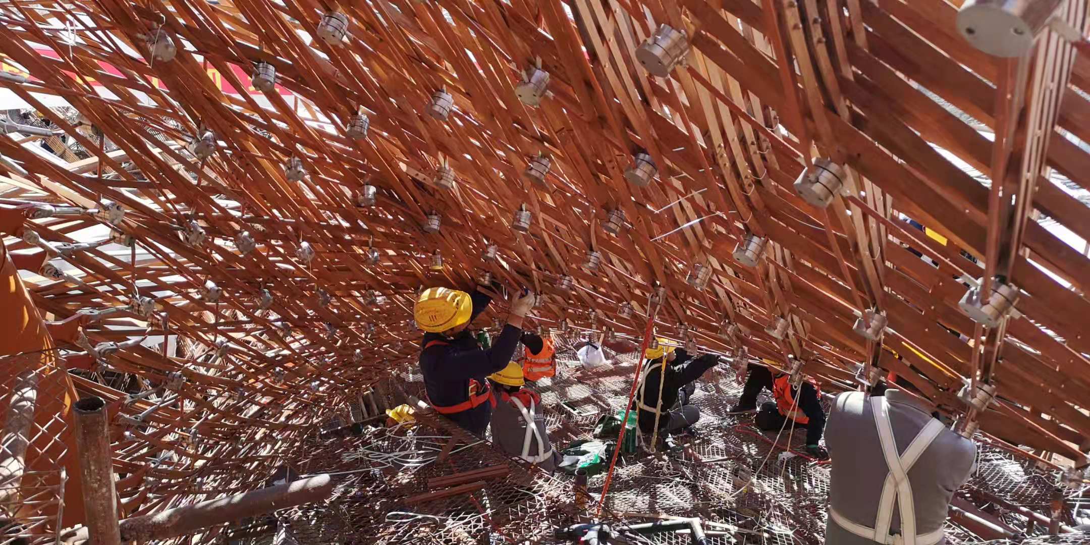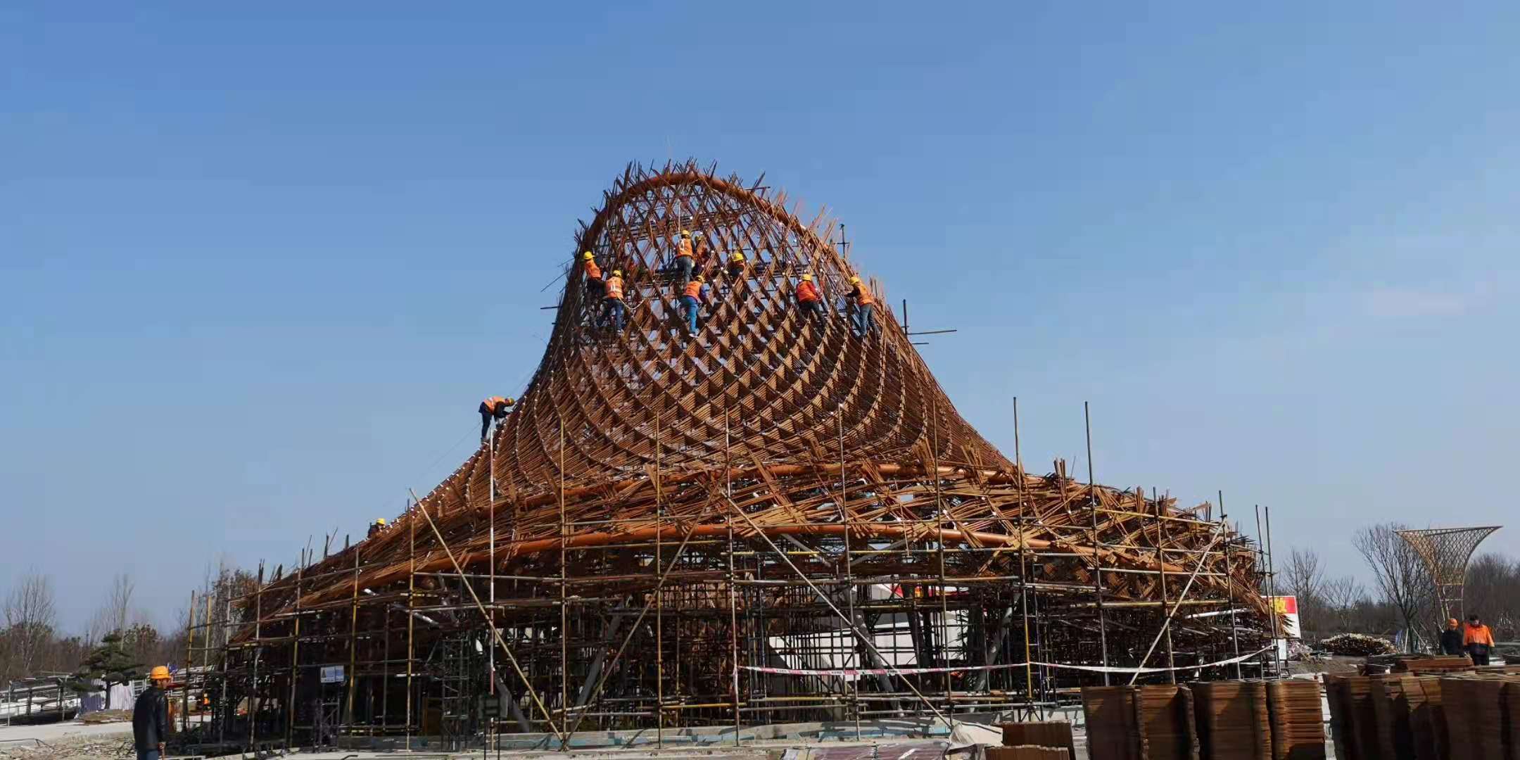 编织不仅要求牢固,还要求美观,因此,每一根竹钢在交叉点处都是有切口的,类似于一个简易的榫卯结构。同时,还要兼顾相当于720度的弯曲度,因此,施工难度可见一斑。