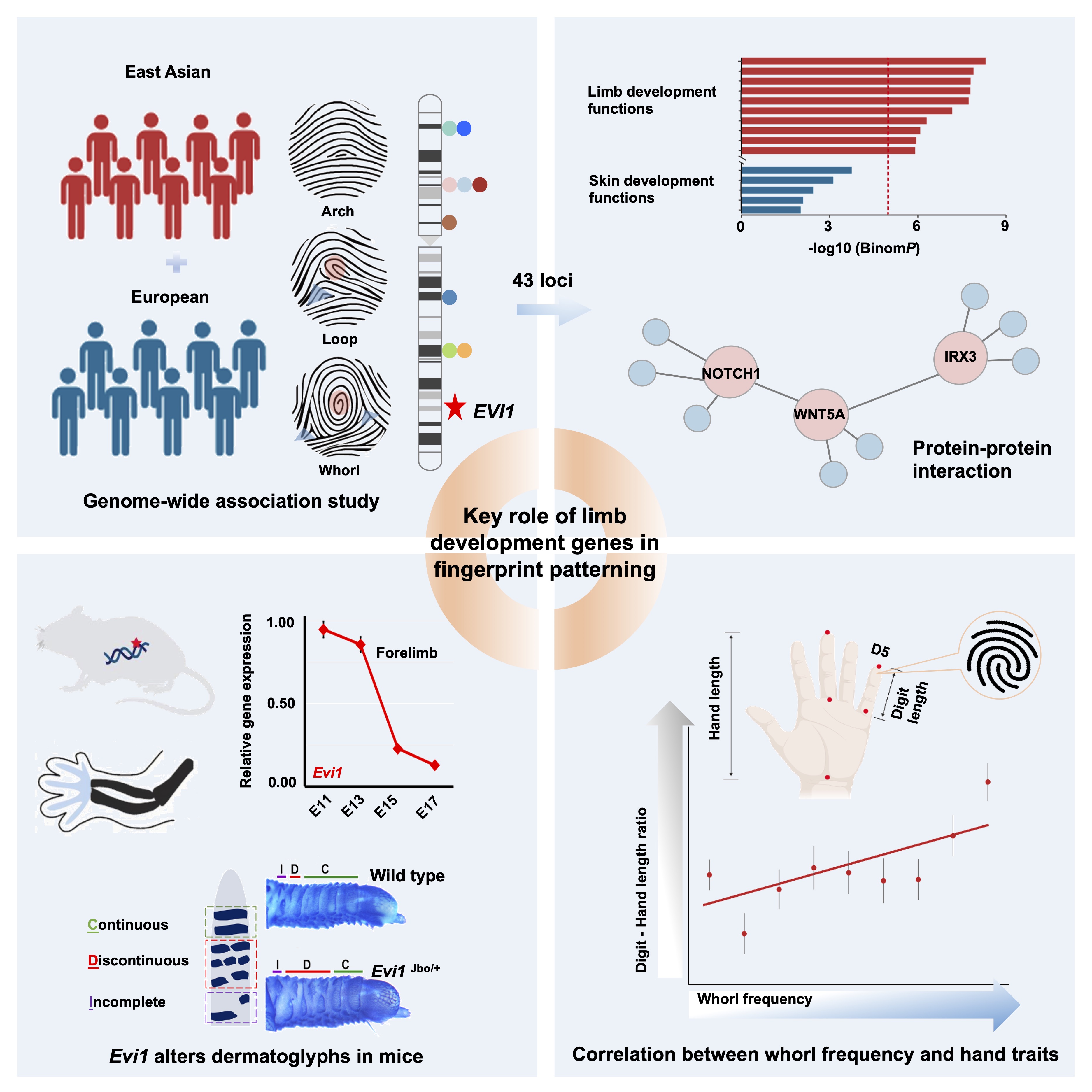 “我们观察到,这些基因显著富集在肢体发育与形成的相关通路,而非皮肤发育相关通路。”这一特征的发现令团队欣喜不已。其中,位于3q26.2区域临近EVI1基因的变异位点与中间三枚手指指纹的复合表型显著相关,从而为上世纪初即被发现的“指纹模块现象”(中间三枚手指指纹高度相关)提供了表型组学和遗传学解释。