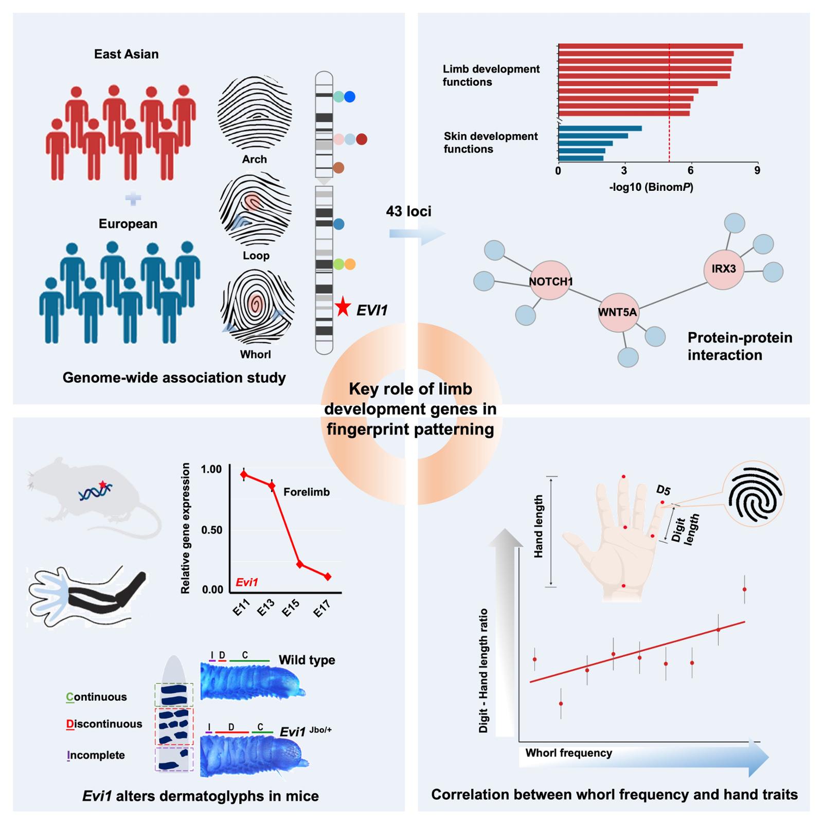 “肤纹表型是人体外观表型的重要组成部分,和人体其它表型与疾病都有密切的联系。通过这项研究,我们揭示了影响指纹花纹形成的是一系列肢体发育相关的重要基因,而这些基因在人体发育中往往起着重要的‘一因多效’作用。”汪思佳表示。正如比邻排列的“多米诺骨牌”,肢体发育基因是指纹的内在影响因素。