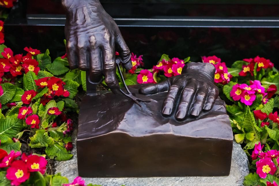 落葬现场,吴孟超院士、吴佩煜教授的纪念像巍然屹立。纪念像由上海大学美术学院副院长、雕塑系主任蒋铁骊创作。吴孟超院士穿着爱了一生的军装目视远方,平和的眼神中透着坚定。纪念像右侧的一方石碑上,寥寥数语凝练了吴老一生的努力与突破,左下角摆放着吴老右手手模,这只手食指、无名指关节异于常人,是经年累月与手术刀并肩战斗刻画的痕迹,不禁让人无限感慨。