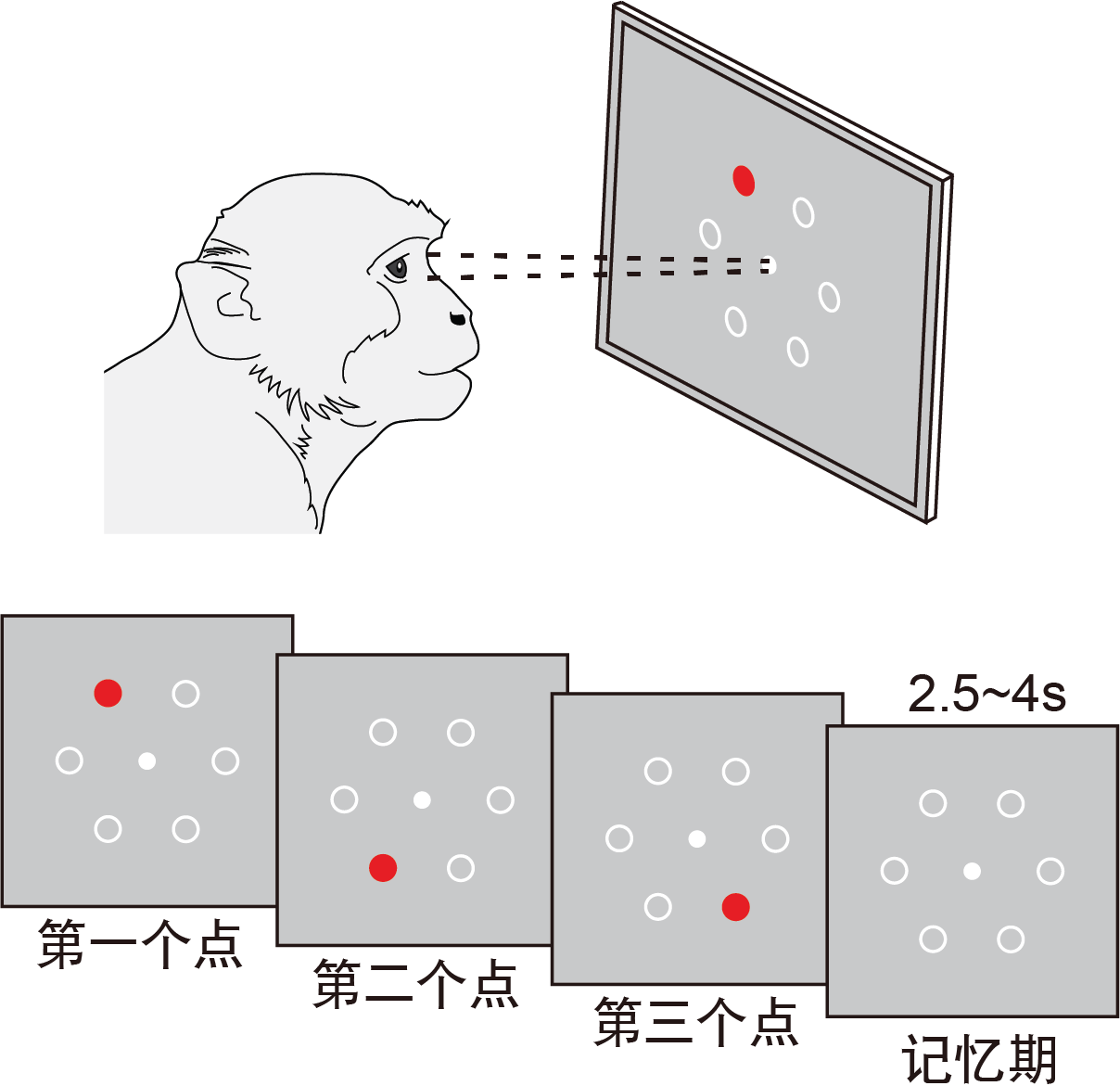 在任务中,猕猴面前的屏幕上会依次闪现三个不同的点,猕猴需要在几秒钟之后将这些点按之前呈现的顺序汇报出来。在汇报前的几秒记忆保持期内,空间序列的信息便以工作记忆的形式被暂时储存在大脑中。