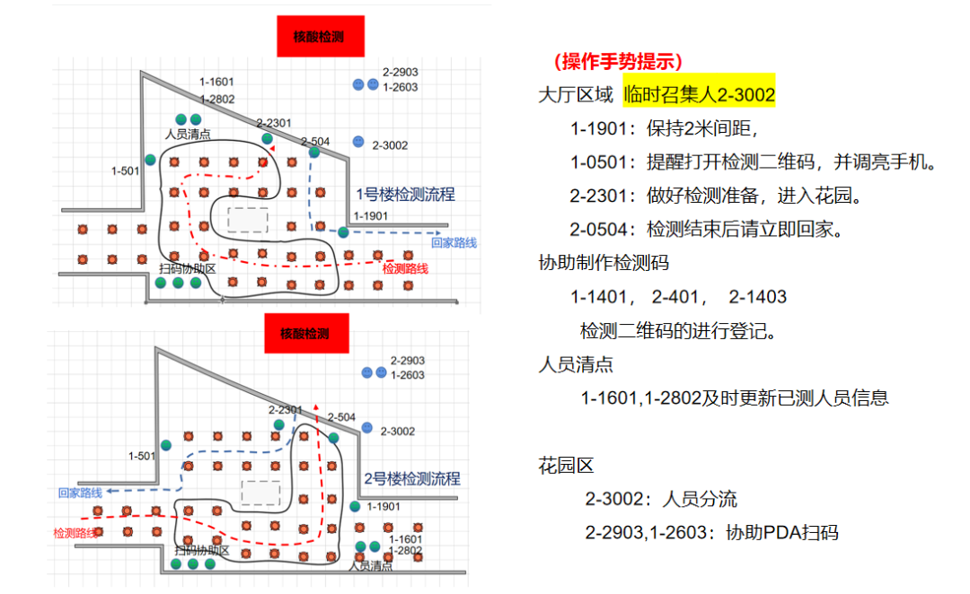 据了解,泰荣苑的楼层比较高,每号楼都有30层,每层3到4户人家。考虑到在疫情期间,高楼层住户乘坐电梯下楼时可能会出现人群拥挤的情况,在核酸检测的前一晚,张院长和他的爱人一起设计出了核酸检测“路线图”以及人群引导卡片。第二天还在大厅内贴上了引导地贴,用于人群分流,并且修改了电梯乘坐流程。