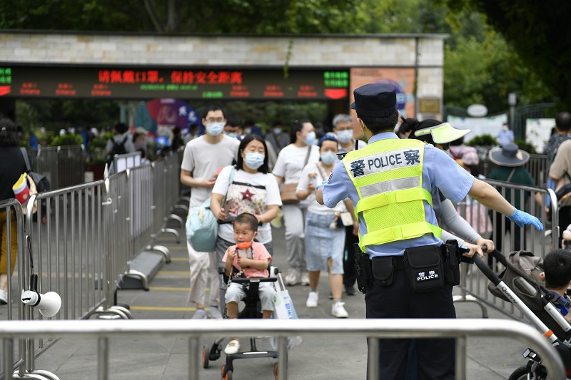 根据相关防疫规定,园方采取预约制,并按属地程家桥派出所要求,增加隔离栏形成蛇形通道分割切块设置成排队通道和外围等候区,严格落实“两米线,严格控制排队人数。园方在入口处布置了“数字哨兵”核验和体温测量,以防入口人流积压。游客入场需提供72小时核酸检测阴性证明和健康体温,在现场民警及园区安保人员指引下扫描“场所码”或“数字哨兵”扫描“随申码”,即可自动完成健康核验。
