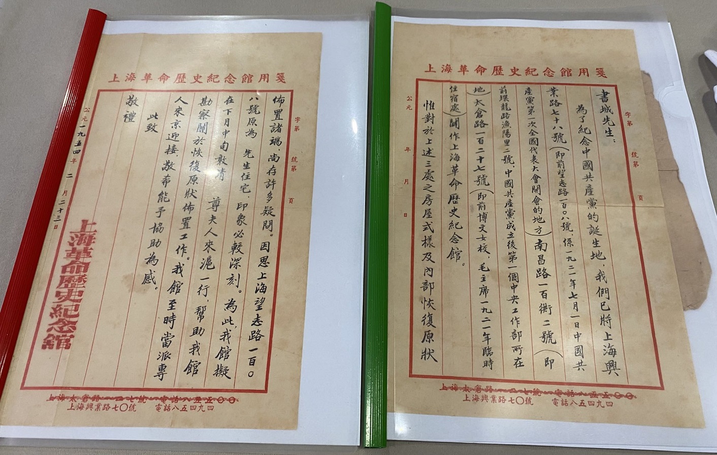 第一件是中共一大会址纪念馆前身上海革命历史纪念馆(筹)于1954年2月23日写给李书城的书信原件,内容是邀请薛文淑赴沪对举办中国共产党第一次全国代表大会的场景进行考证。