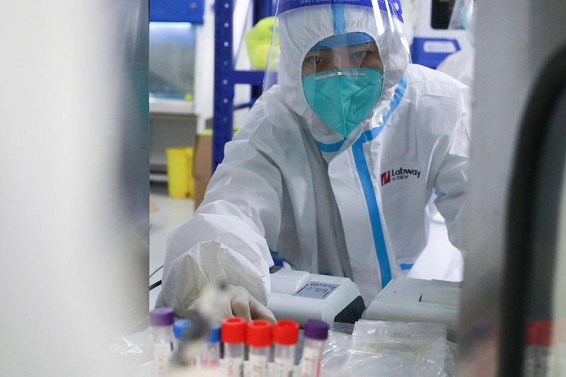 位于长宁区某大楼内的兰卫中心实验室里,即便是深夜时分也总是灯火通明。滴滴答答都是加样的声音,这惊心动魄的一天,不过是战“疫”打响以来的普通一天。据悉,上海中心实验室内,按照日检测工作量18万管的标准配置计算,目前已承接了多个区域的大筛及疾控任务,实验室产能处于满负荷运转的状态。