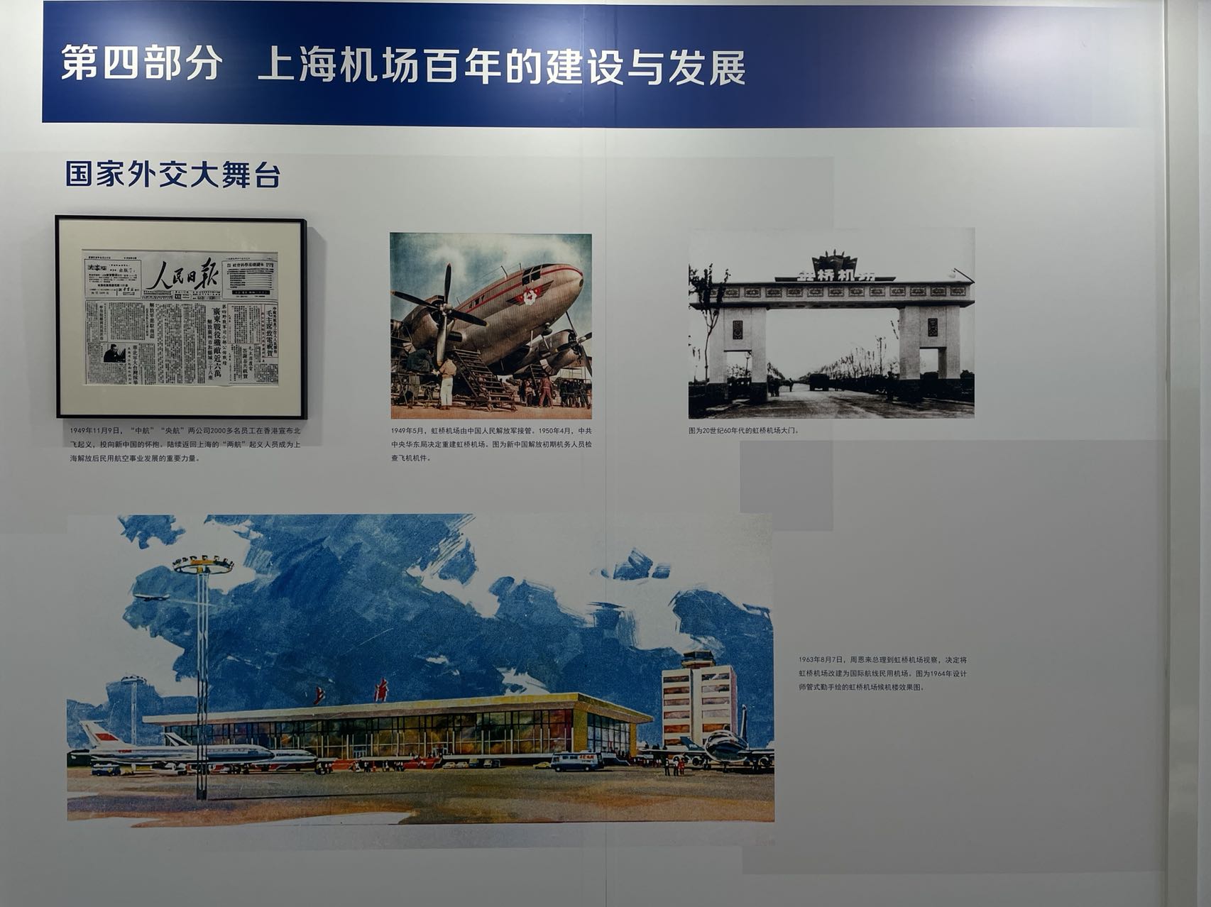 通过珍贵的历史图片、文物和视频展现上海作为一座革命之城、光荣之城在新中国经济发展中的重要地位。在中国共产党的领导下,上海机场从百年前仅有1条土质跑道的虹桥机场,发展成为如今拥有两大机场、四座航站楼、六条跑道、年客货吞吐量超1亿人次和400万吨的世界级航空枢纽的建设发展史。上海机场建设发展的一百年正是上海城市经济发展和中国民航事业发展的重要缩影之一。