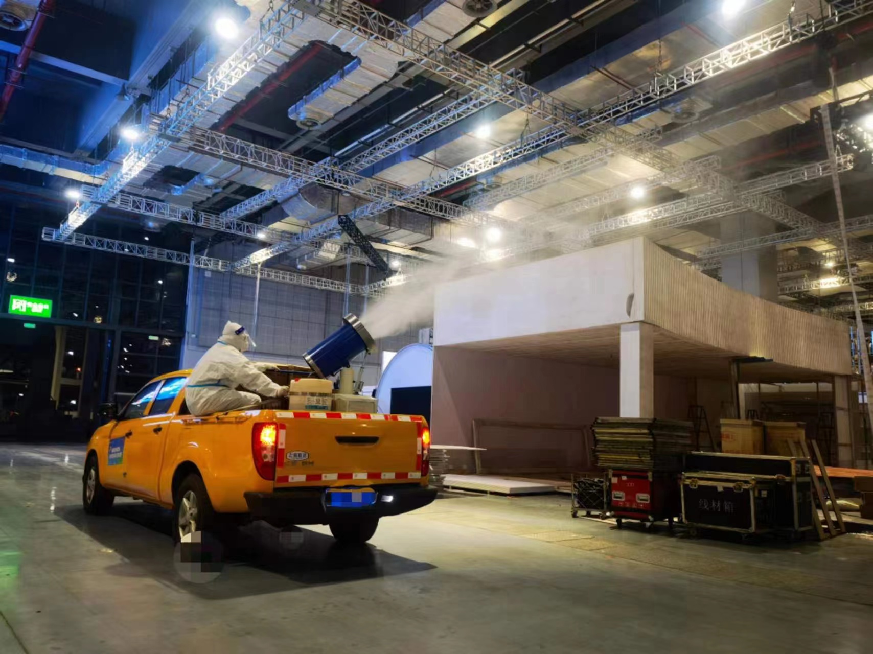 同时,他们还承担位于国家会展中心P6和北广场核酸检测点的环境消杀工作,每天当场馆布展人员离开后,他们还要对全部15个场馆做好环境预防性消毒。可以说,他们是每天最后离开场馆的人。