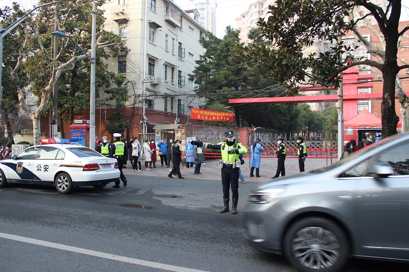 针对辖区内8个考点,虹口警方提前部署安保警力,为3000名考生全力做好护考工作。为了方便开车送考的家长,警方还充分挖掘考点周边公共停车资源,加大停车泊位供给,同时设置临时指路标识,保障考点周边道路畅通。各考点警力于早上7点就已提前就位,在校门口因地制宜开辟候考缓冲区域,提醒考生有序排队等候并保持间距,做好疫情防控和现场秩序维护。