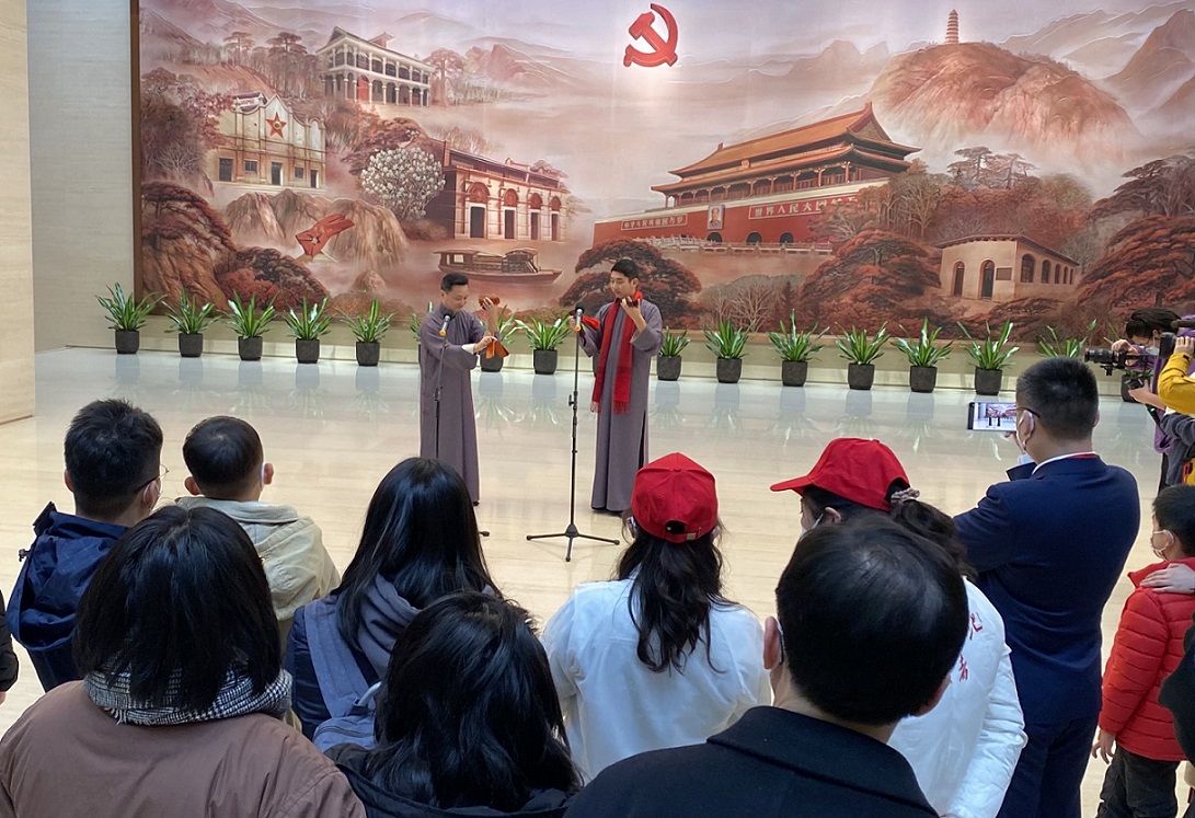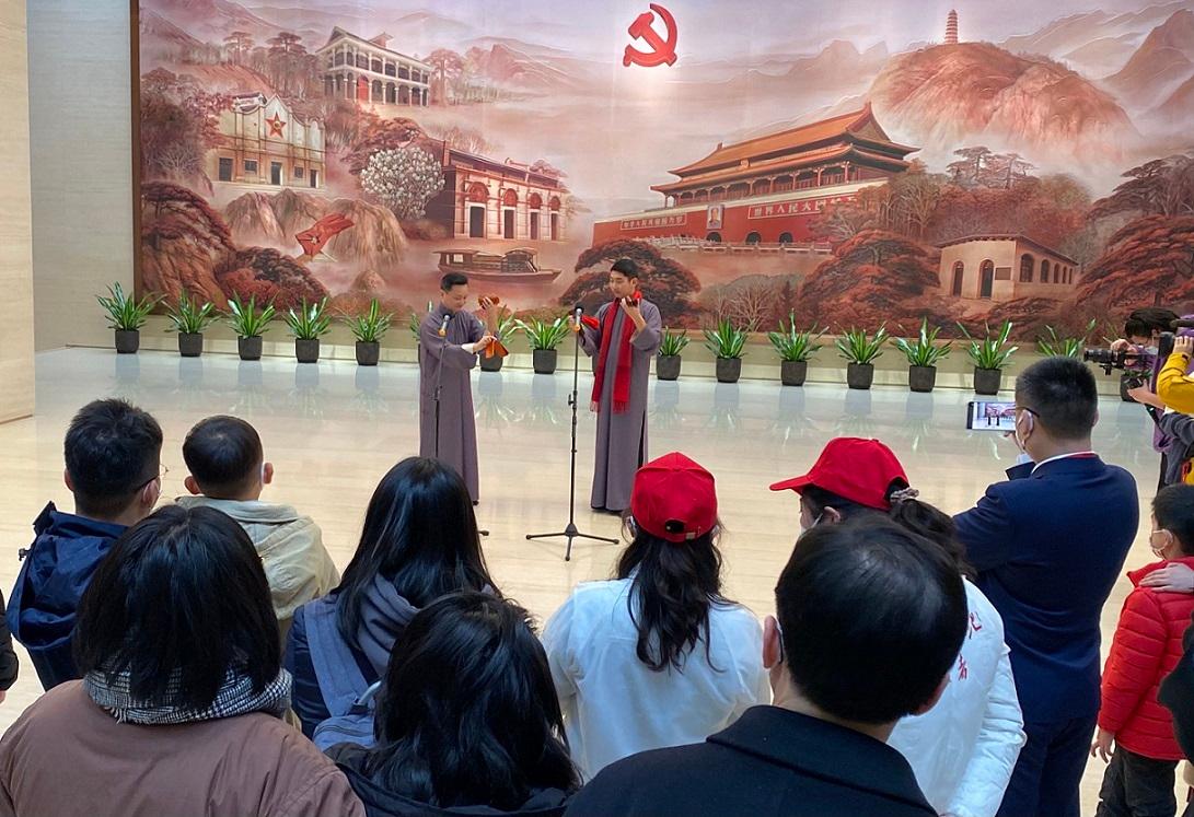 上午,上海曲艺家协会的赵松涛老师父子,也来到了党的诞生地,他们是来为观众献上曲艺党课《南陈北李 相约建党》《伟大开端》。跨越时空梦幻的联动,给参观者带来了一场难得的沉浸式视听盛宴。